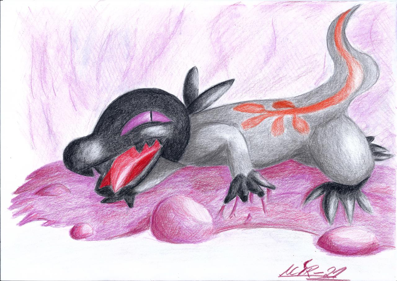 - M Lebt in Vulkanen und trockenen Felsgebieten. Mit seinem süßlich duftenden Giftgas lockt es Käfer-Pokémon an, um sie anzugreifen.