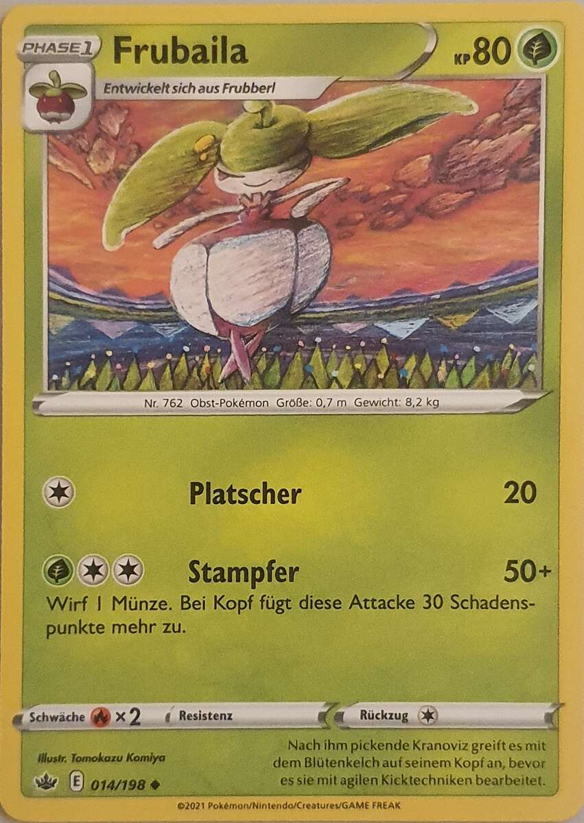- S Seinen Blütenkelch hat es zum Selbstschutz ausgebildet. Er ist so hart, dass selbst das Picken von Vogel-Pokémon es nicht stört.