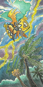 Während der Nachmittag voranschritt, schauten sie überall, konnten jedoch kein Wuffels entdecken. Auf dem Weg zum Strand bemerkte Bamelin aus dem Augenwinkel, dass ein schwebendes Pokemon ihnen zu folgen schien; konnte es aber nicht genau erkennen. Hingegen die Wolken waren nicht zu übersehen, es wurden immer mehr und der Himmel verfinsterte sich mit jeder weiteren Minute. Trotzdem wollte Kristin nicht aufgeben. Als sie den Strand erreichten, war von einem Wuffels immer noch keine Spur zu sehen. Bevor sie umkehren konnten, zog ein stürmischer Wind auf und es begann aus dem Himmel zu schütten. Donner grollte und einen Augenblick später zuckten die ersten Blitze durch das dunkle Wolkendach. Kristin und Bamelin suchten Schutz unter einer Palme, die sich plötzlich zu ihren herunterbeugte und kopfüber schief angrinste.