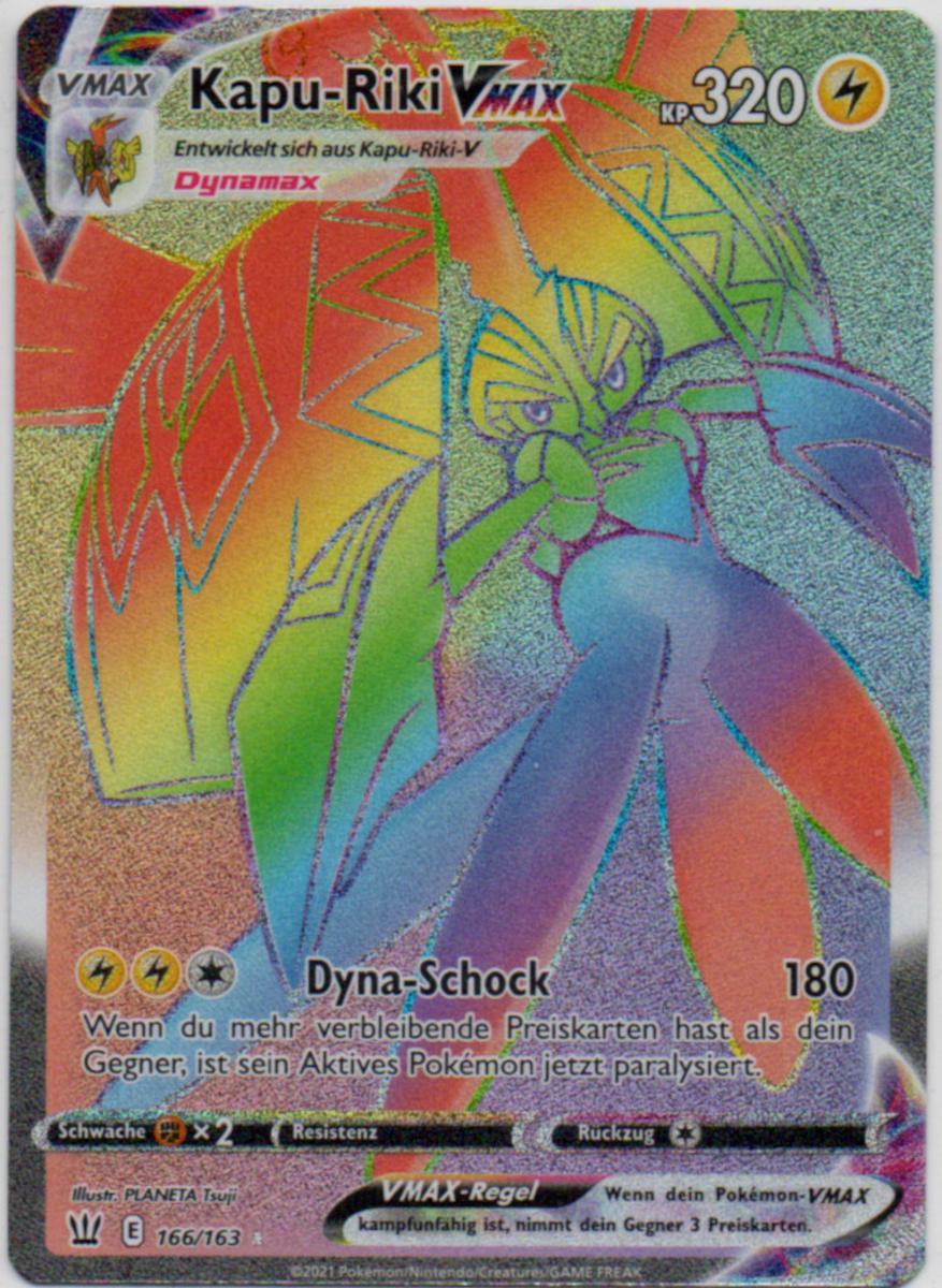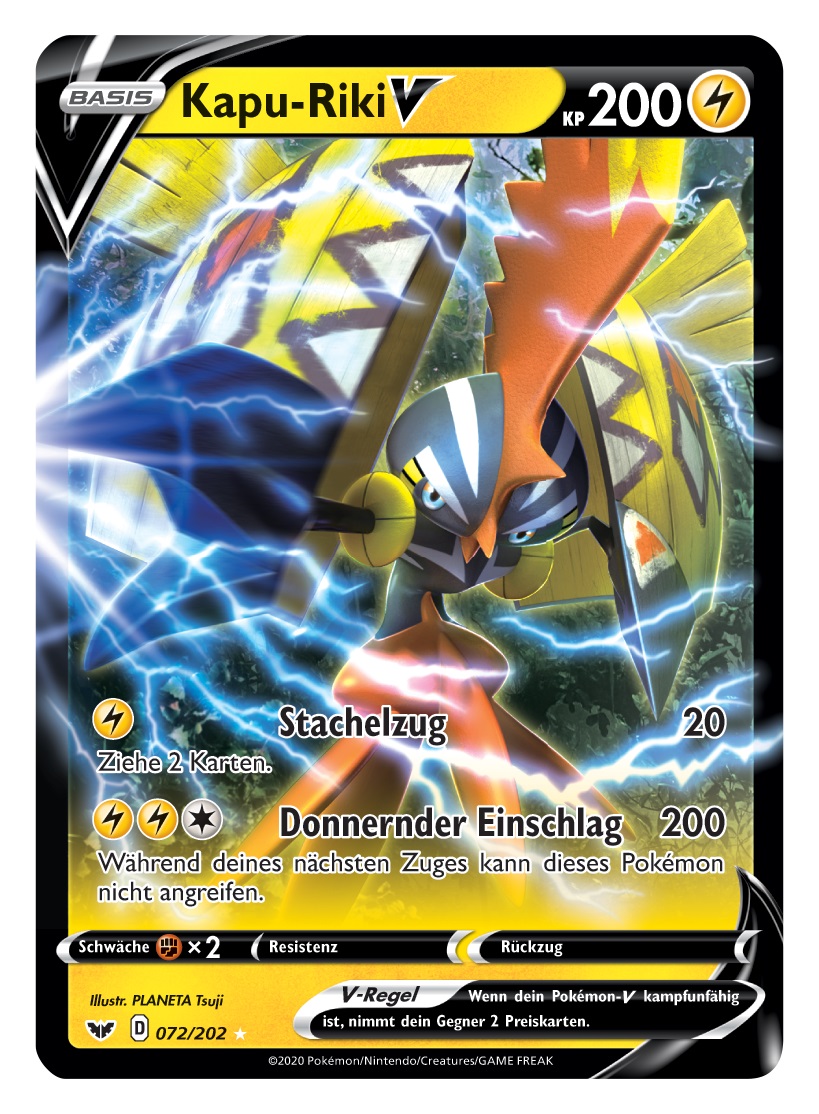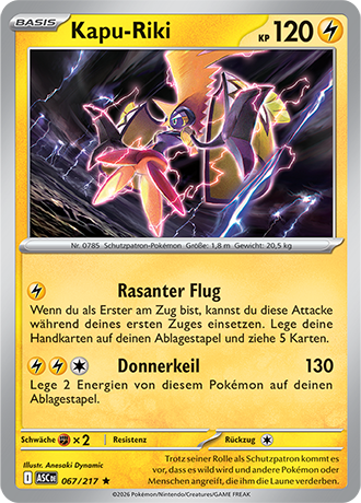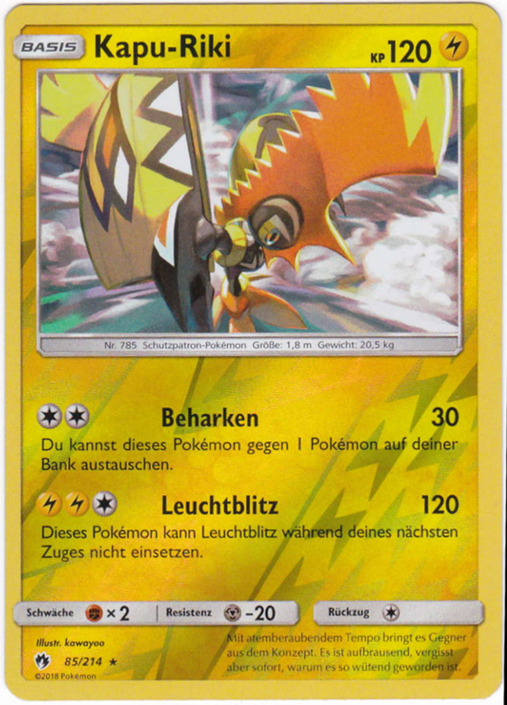 Standard-Kapu-Riki. Durch seine Fähigkeit erhalten seine Elektro-Attacken einen Schadensmultiplikator von 1.5, weshalb im Normalfall auch auf die 2 Elektro-STABs zurückgegriffen wird. Ladungsstoß dient vor allem dazu, gegnerische Blitzfänger-Pokémon umgehen zu können und harmoniert wunderbar mit einem Boden-Pokémon wie Knakrack.