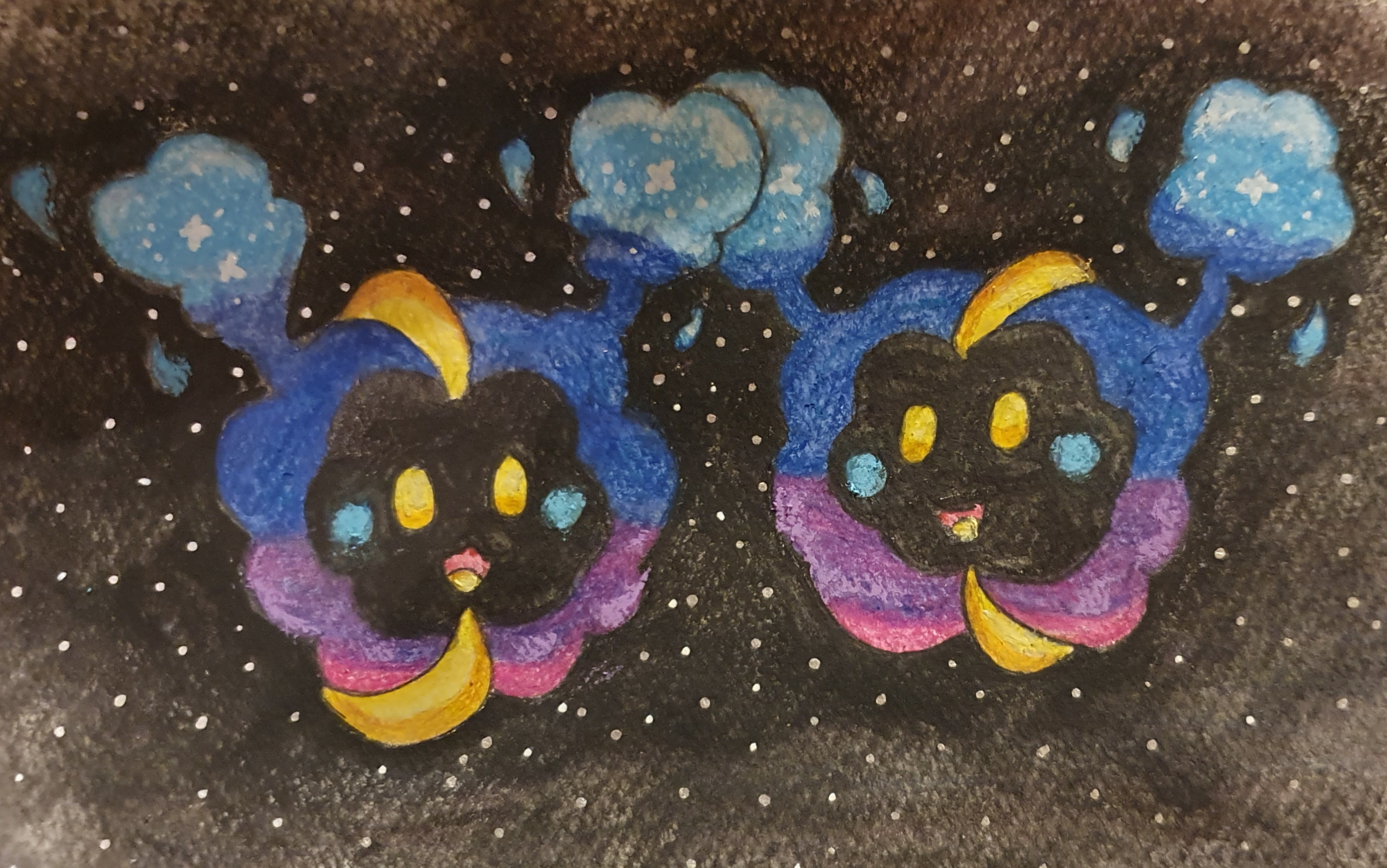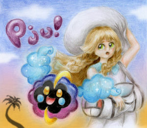 Der Wind führt dich fort, lachendes Wölkchen in der Luft. Aus dem fremden Universum kommst du und hast eine Freundin fürs Leben gefunden. Von allen Lebewesen eines der reinsten Herzen erwischt. Sammelst den Duft der Sterne in dir, Cosmog, und führst sie zum Strahlen zusammen. Versammelt bricht das Licht des Kosmos in dir. Bunte Farben erzählen Geschichten deiner Reisen durchs All. Ist es der Duft von vergangenen Sternen? Wenn du lachst, rieselt es Staub. Wo er herkommt, weiß niemand mehr. Lächelnd springst du herum. Mit dir scheint das Universum so nah wie nie und endlich nicht mehr erdrückend groß.