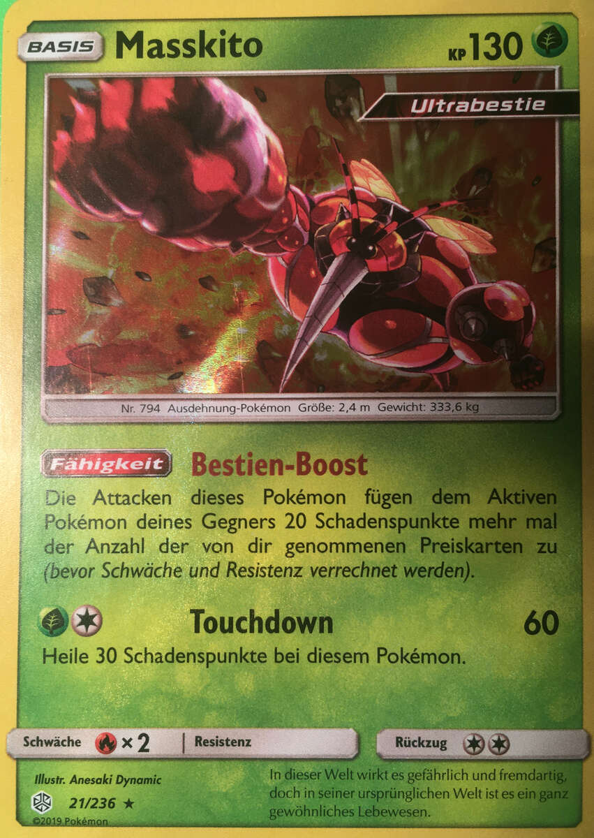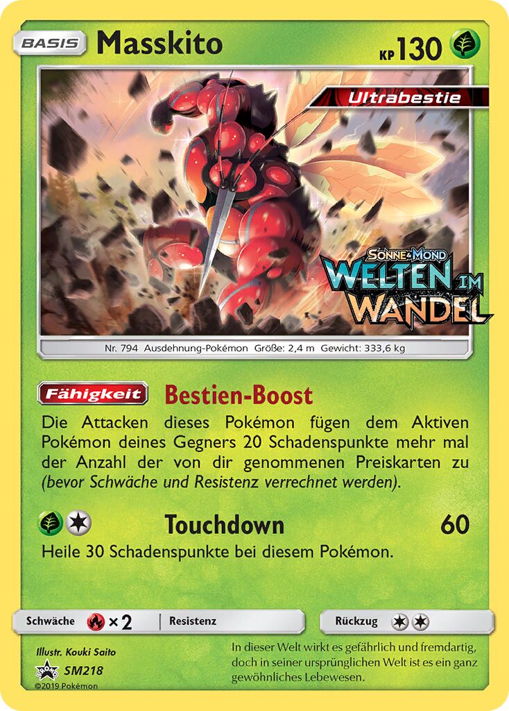 Ist ein ziemlich guter Tank und hat die Möglichkeit sehr viele Unlichttypen zu checken und vorallem Schabelle, dessen Eisstrahl drei Treffer für den KO benötigt. Somit kann man den Schaden mit Ruheort wieder ausgleichen und bei Schabelle Leben-Orb-Schaden anhäufen. Mit 84 Atk erhält man einen Zusatzpunkt durchs Wesen und außerdem besiegt man physisch defensive Demeteros-T nach Bedroher und Tarnsteineschaden. 12 Speed für uninvestierte Base 80er Mons. Blutsauger kann auch durch Anfallen ersetzt werden, und Power-Punch ist einfach ein Nuke der dank dem Z-Kristall sofort zuschlägt ohne Aufladerunde. Ich halte dieses Masskito-Set für das momentan effektivste und habe es auch erfolgreich spielen können. Gute Teampartner sind Pokémon wie Tentantel oder Heatran, da Masskito Kampftypen relativ gut checkt. Außerdem sollte man einen Hazardleger spielen, der Tapu Fini besiegt, weil dieses gegen Masskito problemlos Auflockern einsetzen kann.