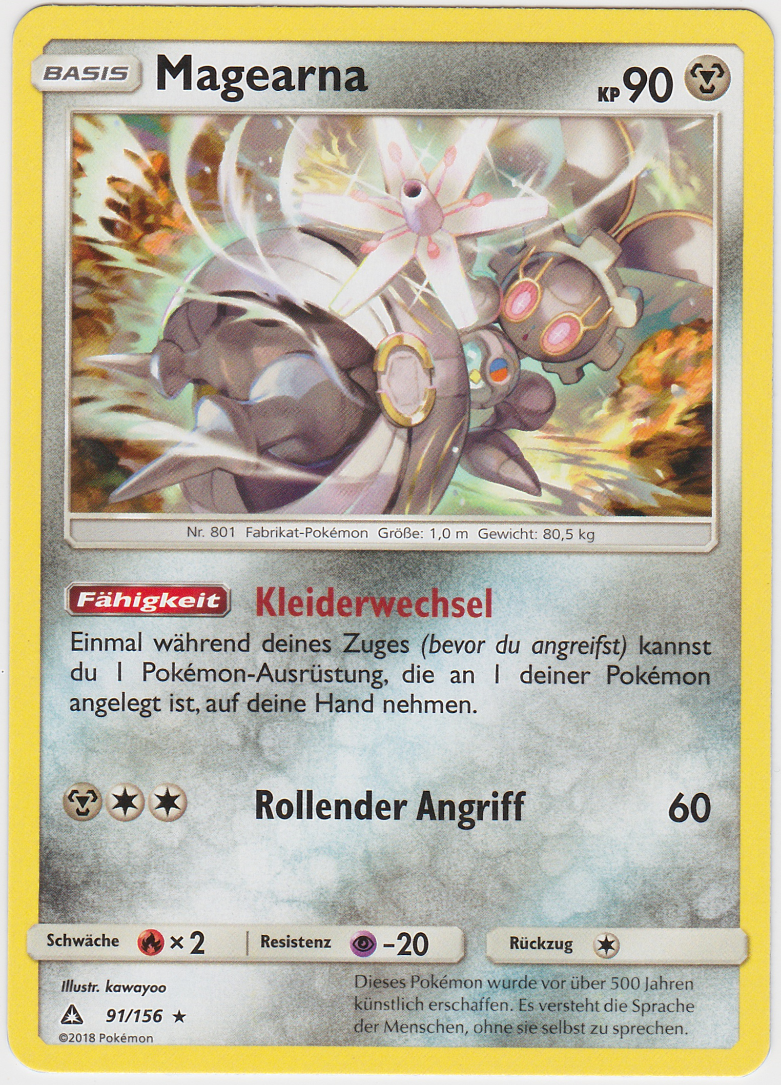 - US So sah Magearna vor etwa 500 Jahren aus. Sein Körper ist lediglich ein Gefäß, das eigentliche Pokémon ist eine künstlich erschaffene Seele.