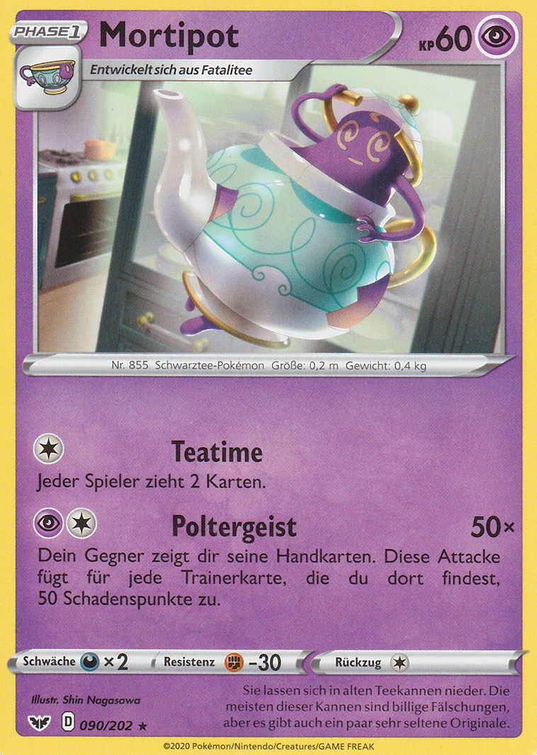 - K Die Teekanne, in der es haust, hat keinen Einfluss auf dieses Pokémon. Dafür ist sein Charakter je nach Art des Schwarztees ein anderer.