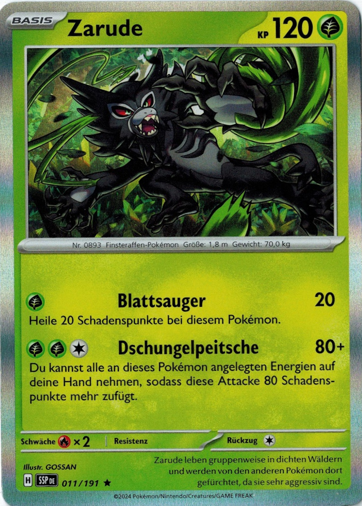 - SWRI Zarude leben gruppenweise in dichten Wäldern und werden von den anderen Pokémon dort gefürchtet, da sie sehr aggressiv sind.
