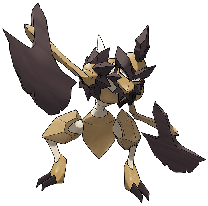 - P Dieses grobe, ungehobelte und aggressive Pokémon wirbelt wild mit seinen wuchtigen Äxten aus Stein, um Beute niederzustrecken.