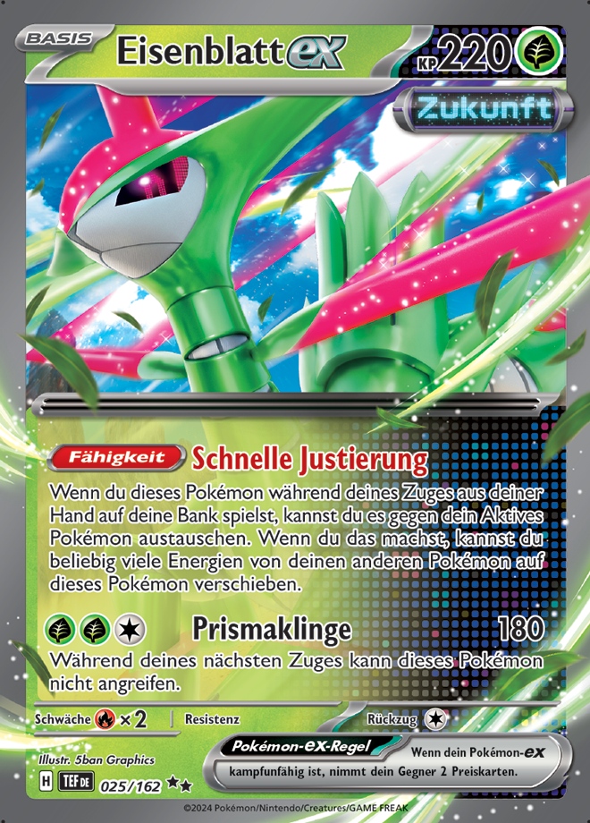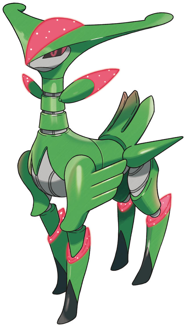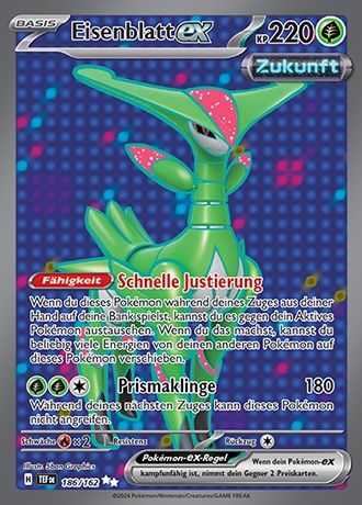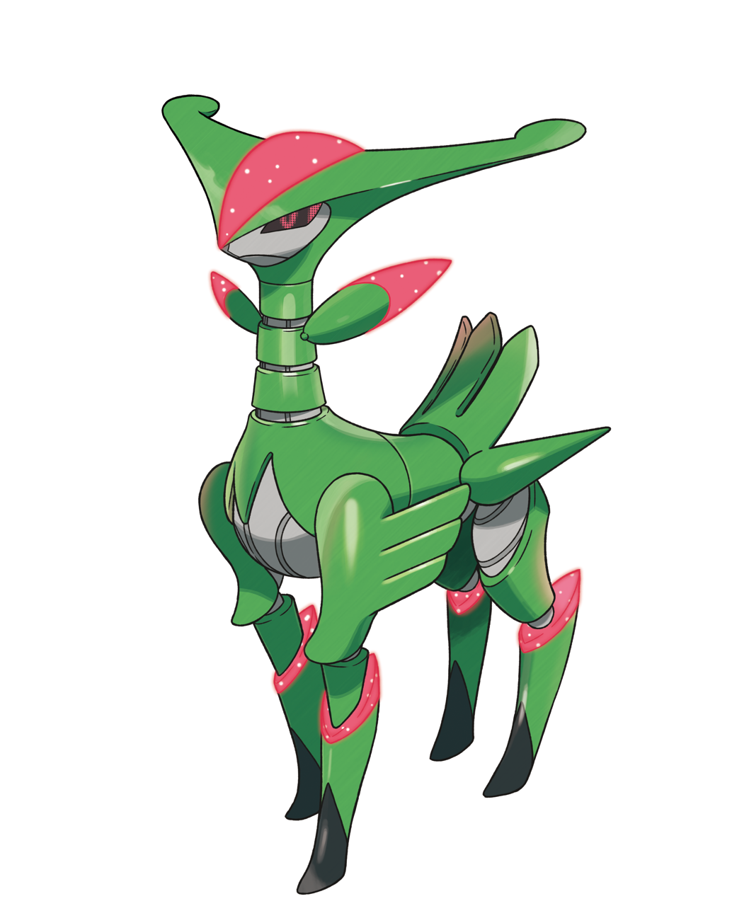 - P Einigen wenigen Augenzeugenberichten zufolge hat dieses Pokémon mit seinen leuchtenden Schwertern riesige Bäume und Felsen zerkleinert.