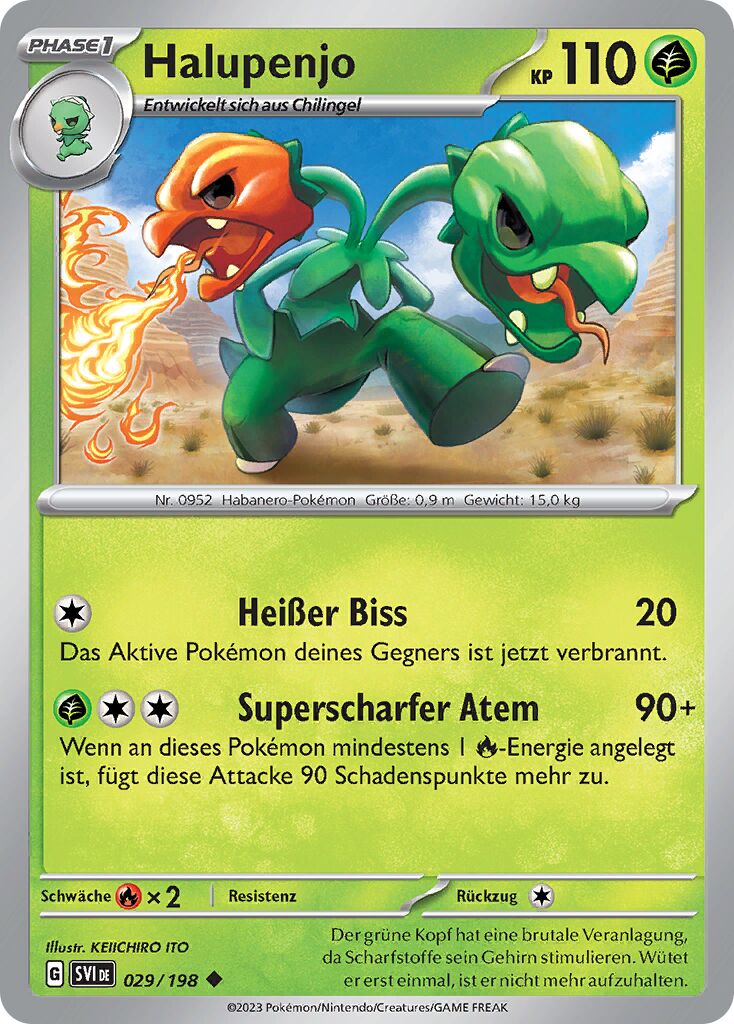 Halupenjo besitzt die Pokédex-Nummer #952 und ist ein Pflanze / Feuer-Pokémon der neunten Generation. Seinen ersten Auftritt in Videospielen hat es in Pokémon Karmesin & Purpur.