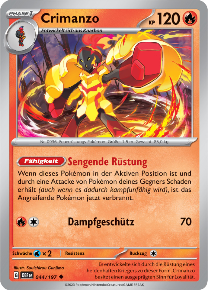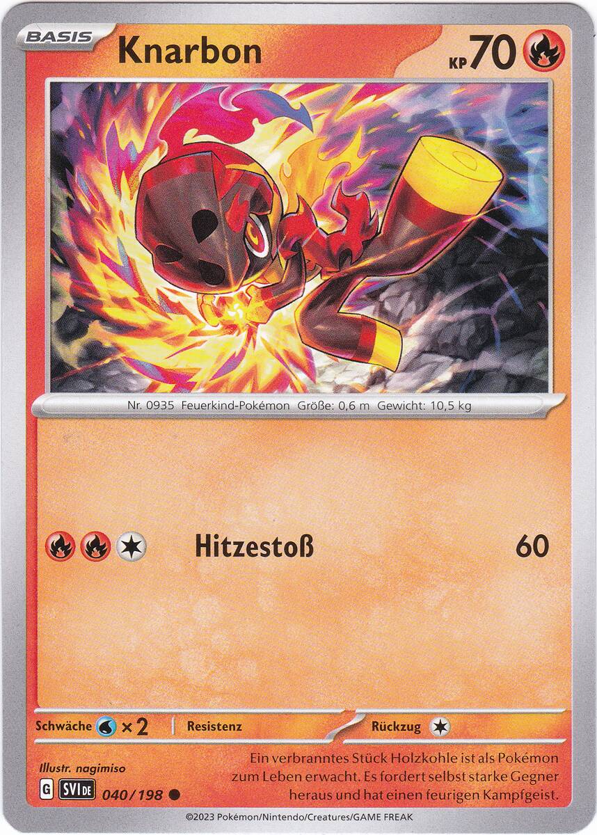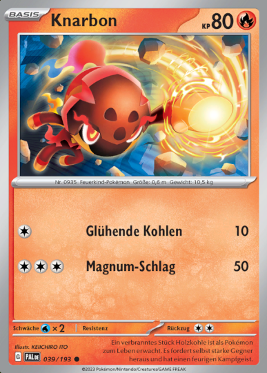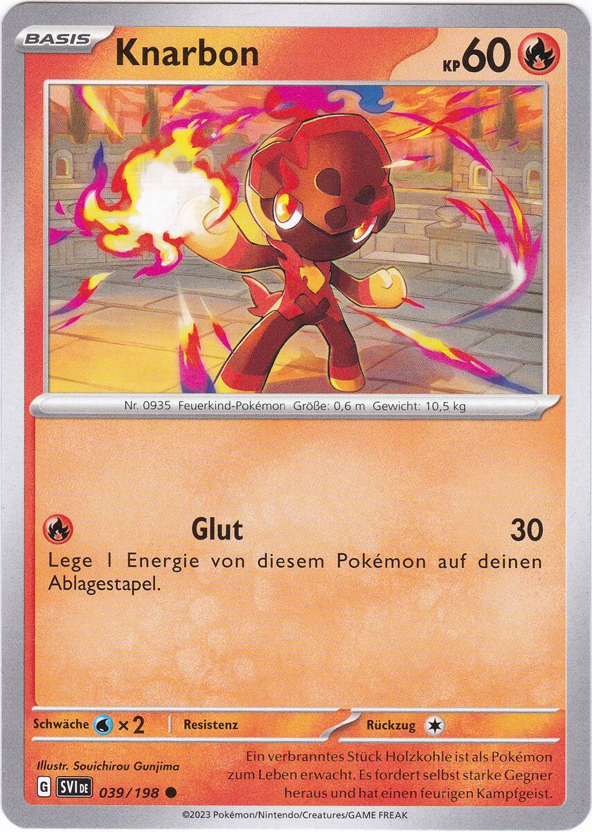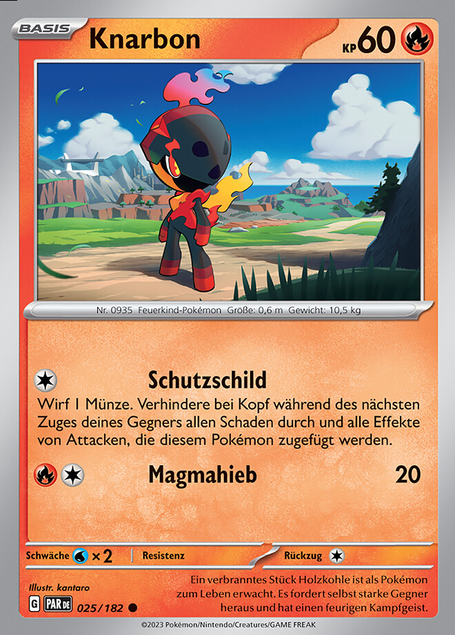 - K Ein verbranntes Stück Holzkohle ist als Pokémon zum Leben erwacht. Es fordert selbst starke Gegner heraus und hat einen feurigen Kampfgeist.