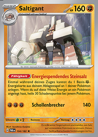 - P Viele Pokémon scharen sich um Saltigant, in der Hoffnung, an seinem mineralreichen Salz lecken zu können.