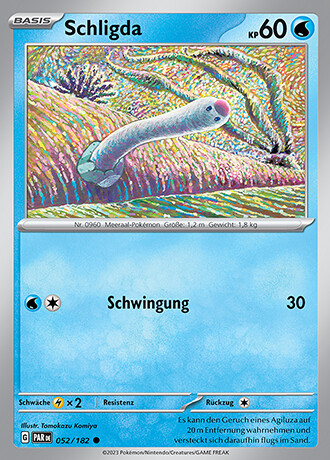 Schligda besitzt die Pokédex-Nummer #960 und ist ein Wasser-Pokémon der neunten Generation. Seinen ersten Auftritt in Videospielen hat es in Pokémon Karmesin & Purpur.