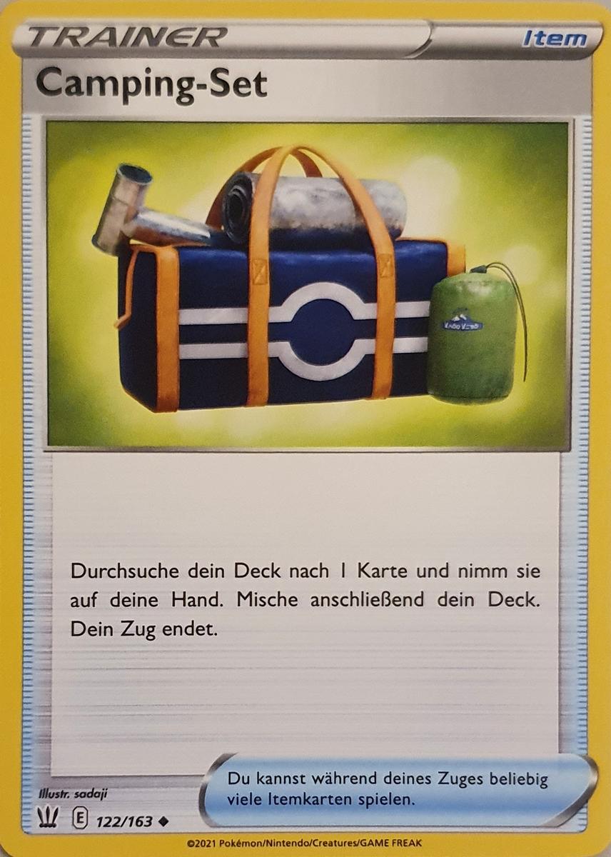 -Pokémon interessant. Das Camping-Set sucht als Item eine beliebige Karte aus dem Deck, beendet dafür aber den Zug. In vielen Decks ist das eher unpraktisch, aber sogenannte Stall-Decks, die nicht unbedingt jede Runde angreifen müssen, aber dafür ihre Unterstützerkarte oft anderweitig nutzen möchten, werden sich darüber freuen.