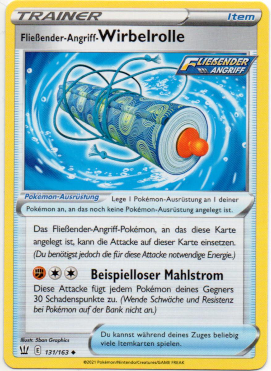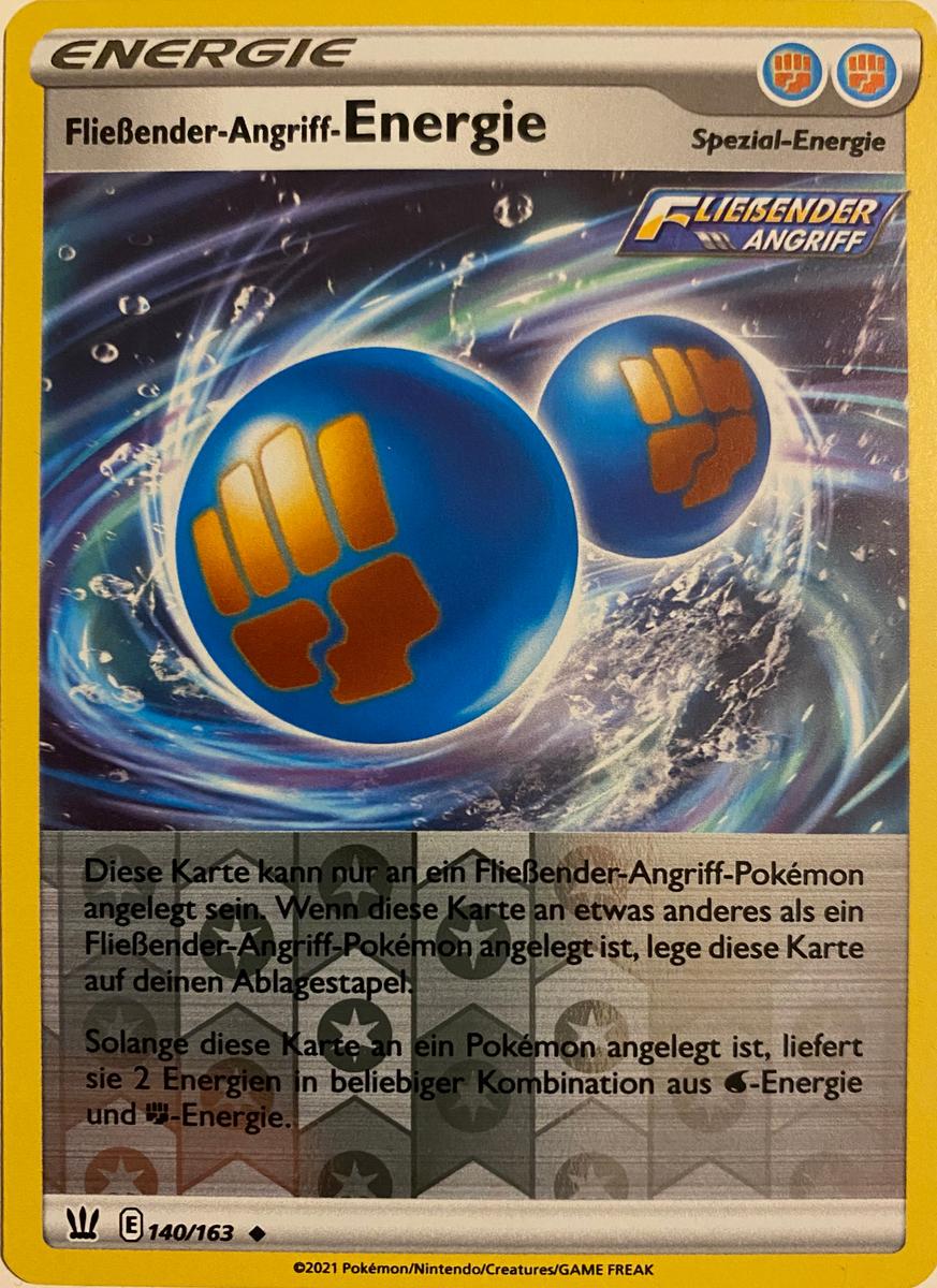 Ein Kernstück aller Decks um die beiden neuen Kampfstile sind die dazugehörigen Spezial-Energien, die jeweils nur an passende Pokémon angelegt werden dürfen. Die Fließender-Angriff-Energie liefert dabei gleich zwei Energien auf einmal, und zwar in beliebiger Kombination aus den Typen Wasser und Kampf. Dies macht entsprechende Decks deutlich schneller, vor allem weil die Energie außer der Restriktion auf Fließender-Angriff-Pokémon keine Nachteile hat und nicht nur farblos ist, was sie von den meisten anderen Mehrfach-Energiekarten abhebt.