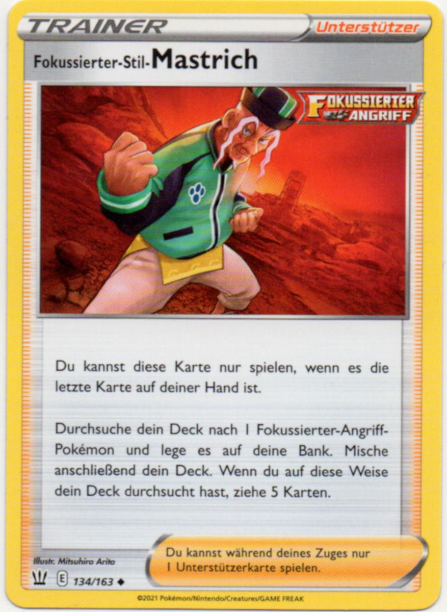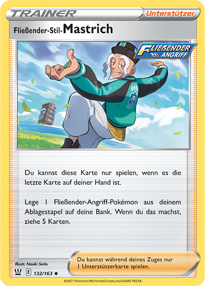 Natürlich ist da auch Meister Mastrich nicht weit, und funktionial scheint er hier die Team-Bosse aus Protoschock zu imitieren. Ist seine Unterstützerkarte die letzte in der Hand, bringt er ein Fokussierter- bzw. Fließender-Angriff-Pokémon einer beliebigen Entwicklungsstufe direkt ins Spiel und zieht dann auf 5 Handkarten auf. Wer findet, dass die neuen Pokémon ruhig mehr Attacken draufhaben dürften, ist mit den beiden Schriftrollen als Ausrüstung gut bedient. Sie erweitern das Arsenal von Fokussierter- und Fließender-Angriff-Pokémon um jeweils einen sehr nützlichen Angriff.