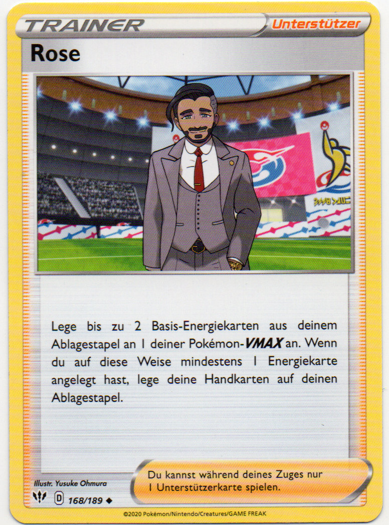 Eure Handkarten sind weg? Rose Tower schafft hier Abhilfe, indem ihr damit jeder Runde bis auf drei Karten aufziehen dürft. Natürlich kann auch euer Gegner diese Stadionkarte nutzen, deshalb macht sie nur Sinn, wenn ihr mit eurem Deck oft eine kleine Anzahl von Handkarten erwartet – beispielsweise indem ihr viel abwerft. Rose selbst hat als kostspieligen Nebeneffekt für seine VMAX-Energiebeschleunigung, dass ihr eure ganze Hand verliert und sollte daher idealerweise nur gespielt werden, wenn sein Turm auch bereitliegt.