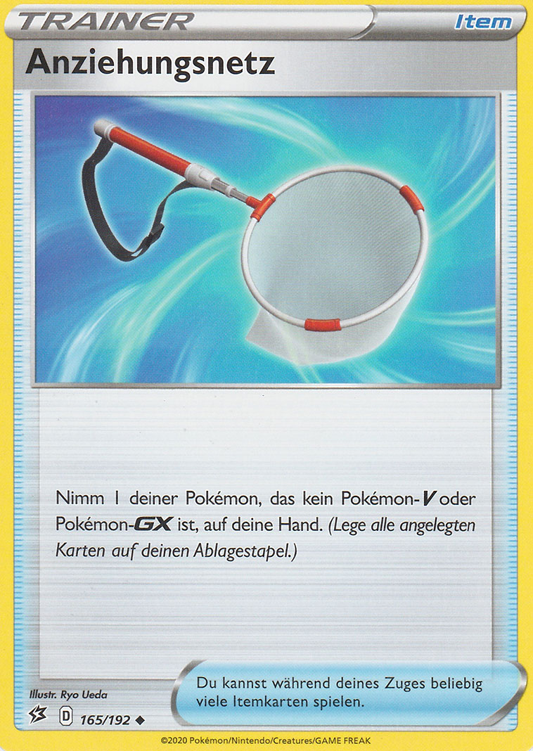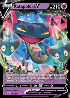 Hier hat Katapuldra nach seinem starken Auftritt in der Videospielszene auch den Sprung ins Sammelkartenspiel geschafft. Im Gegensatz zu manch anderen VMAX-Pokémon ist auch die Vorstufe, Katapuldra V, schon sehr solide, mit bis zu 140 Schaden für zwei Energien. Katapuldra VMAX selbst fügt aber nicht nur direkten Schaden zu, sondern verteilt dabei noch Schadensmarken auf der gegnerischen Bank.