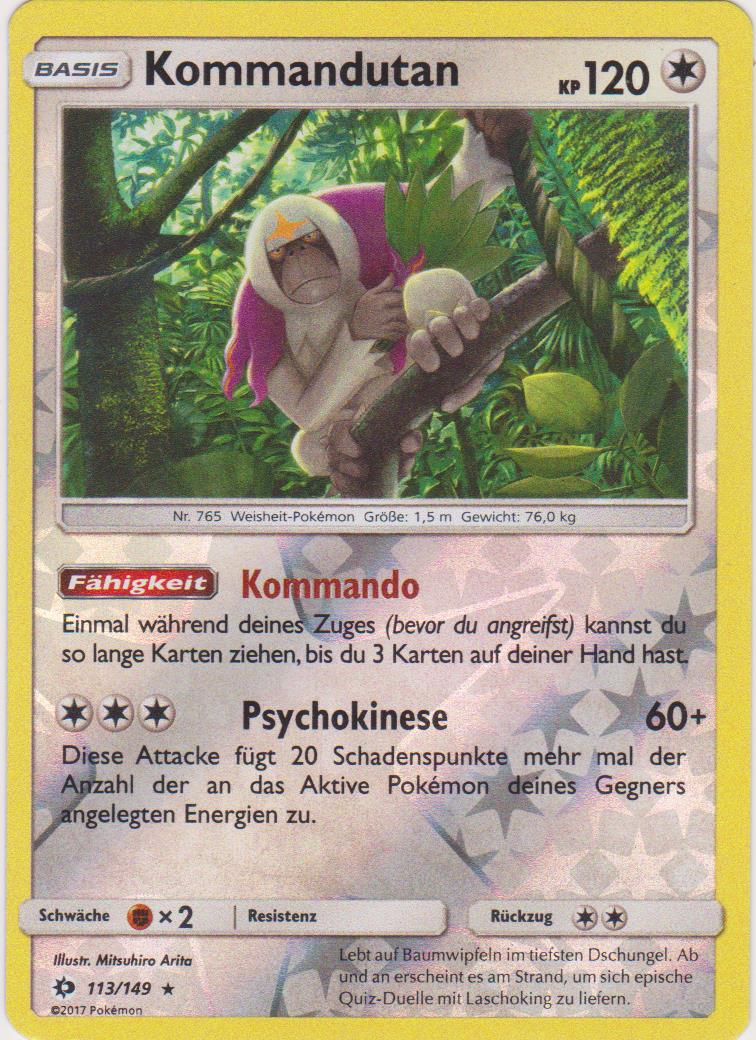 Kommandutan ist im Deck extrem gut, um sich im Lategame vor einem N auf 1 ein Handkarte zu schützen. Es erhöht die Chance durch die zusätzlich ziehbaren Handkarten einen Unterstützer, Kampffahnder oder einen Hyperball für Shaymin EX oder Kapu-Fala GX zu ziehen.