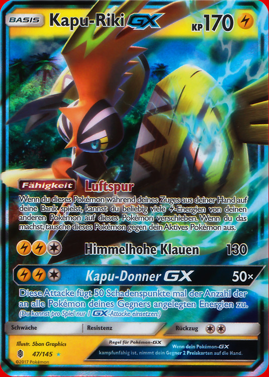 Zudem besitzt es einen Angriff, den wir auch in unserem Deck hin und wieder gut gebrauchen können. Mit “Energieantrieb” fügen wir dem gegnerischen, aktiven Pokemon 20x Schadenspunkte für jede an unserem aktiven Kapu-Fala GX und dem verteidigendem Pokemon angelegte Energie zu. Als kleiner, jedoch verkraftbarer Nachteil wird bei diesem Angriff keine Schwäche verrechnet.