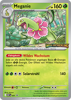 Hier findet ihr eine Übersicht der ME Black Star Promos. Dieses Promo-Set umfasst bisher weit eine bisher unbekannte Anzahl an Karten, die begleitend zum Mega-Entwicklung-Zyklus erscheinen werden. Nicht alle Promo-Karten aus dieser Reihe sind auf Deutsch erschienen. Die Kartennummer dieser Promokarten beginnt mit „MEP“.