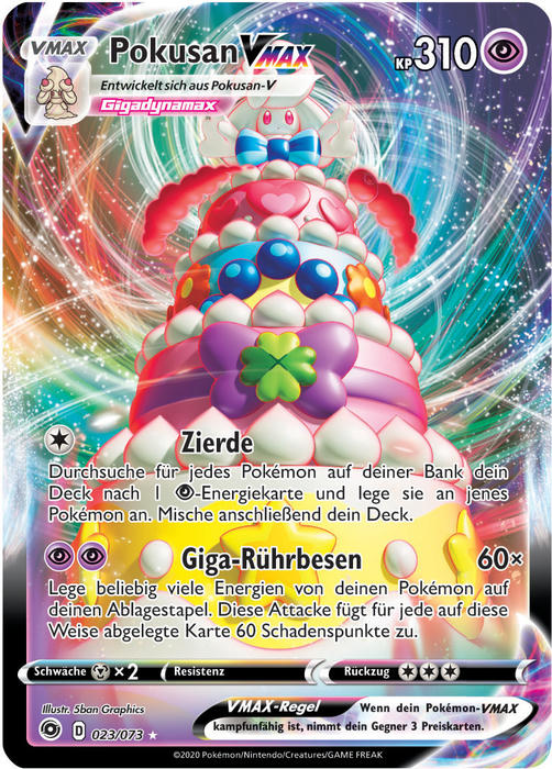 Auf dieser Seite stellen wir die Karten aus der Zusatz-Erweiterung von Schwert & Schild - Weg des Champs vor. Insgesamt sind 80 Karten in diesem Set enthalten, darunter 15 Pokémon-V, drei Pokémon-VMAX, mehr als 19 Trainerkarten sowie eine Spezial-Energiekarten. Darüber hinaus sind vier Vollbild-Pokémon-V und eine Vollbild-Unterstützerkarte enthalten. Die Erweiterung kann lediglich über spezielle Kollektionsboxen gekauft werden.