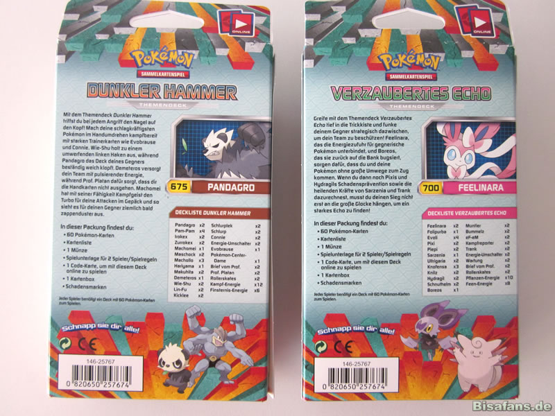 Zur Erweiterung XY03 Fliegende Fäuste erschienen am neben den Boostern auch zwei Themendecks. Diese tragen den Namen "Dunkler Hammer" sowie "Verzaubertes Echo" und drehen sich um Pandagro bzw. Feelinara. Wie gewohnt enthalten die Themendecks 60 vorsortierte Karten, die ein sofortiges Spielen für eine Person ermöglichen. Um zu zweit spielen zu können sind entsprechend zwei Themendecks notwendig.