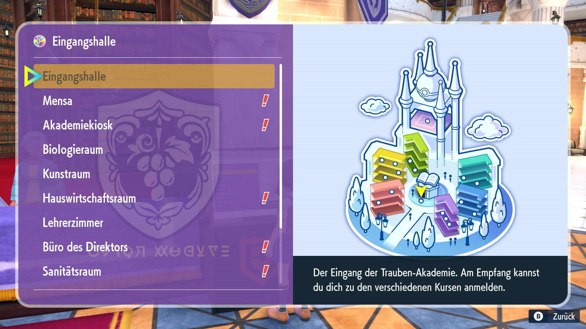 Die Akademie in Pokémon Karmesin und Pokémon Purpur ist ein zentrales Element der Geschichte. Trainer aus der gesamten Region gehen hier zu Kursen, um ihr Wissen aufzubauen und schließlich in die Welt hinausziehen zu können. In Pokémon Karmesin heißt die Akademie Orangen-Akademie und in Pokémon Purpur heißt sie Trauben-Akademie. Die Akademie umfasst insgesamt sieben Kurse.