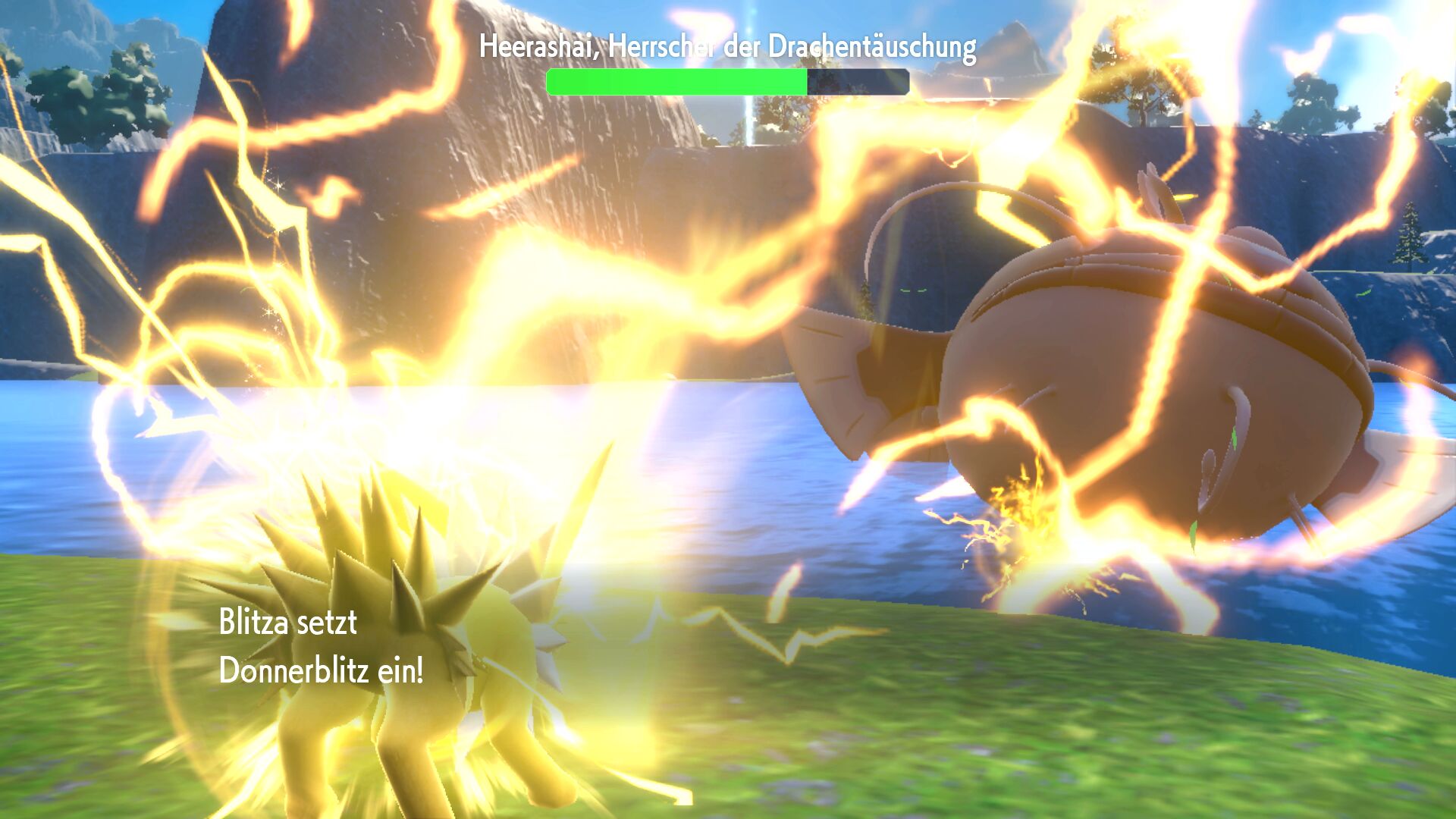 Mit Elektro-Attacken sollte gegen Heerashai grundsätzlich leichtes Spiel bestehen. Sobald es in die zweite Phase geht und das Gewürz gegessen wurde, beherrscht es die Drachen-Attacke Auftischen. Vor Beginn des ersten Kampfes wurde nämlich ein Nigiragi verschlungen und Heerashai wird nun jedes Mal, wenn es einen Treffer bei den eigenen Pokémon landet, den Angriff um eine Stufe erhöhen. Davon abgesehen sollte es aber auch hier wenige Probleme mit Elektro-Attacken geben.