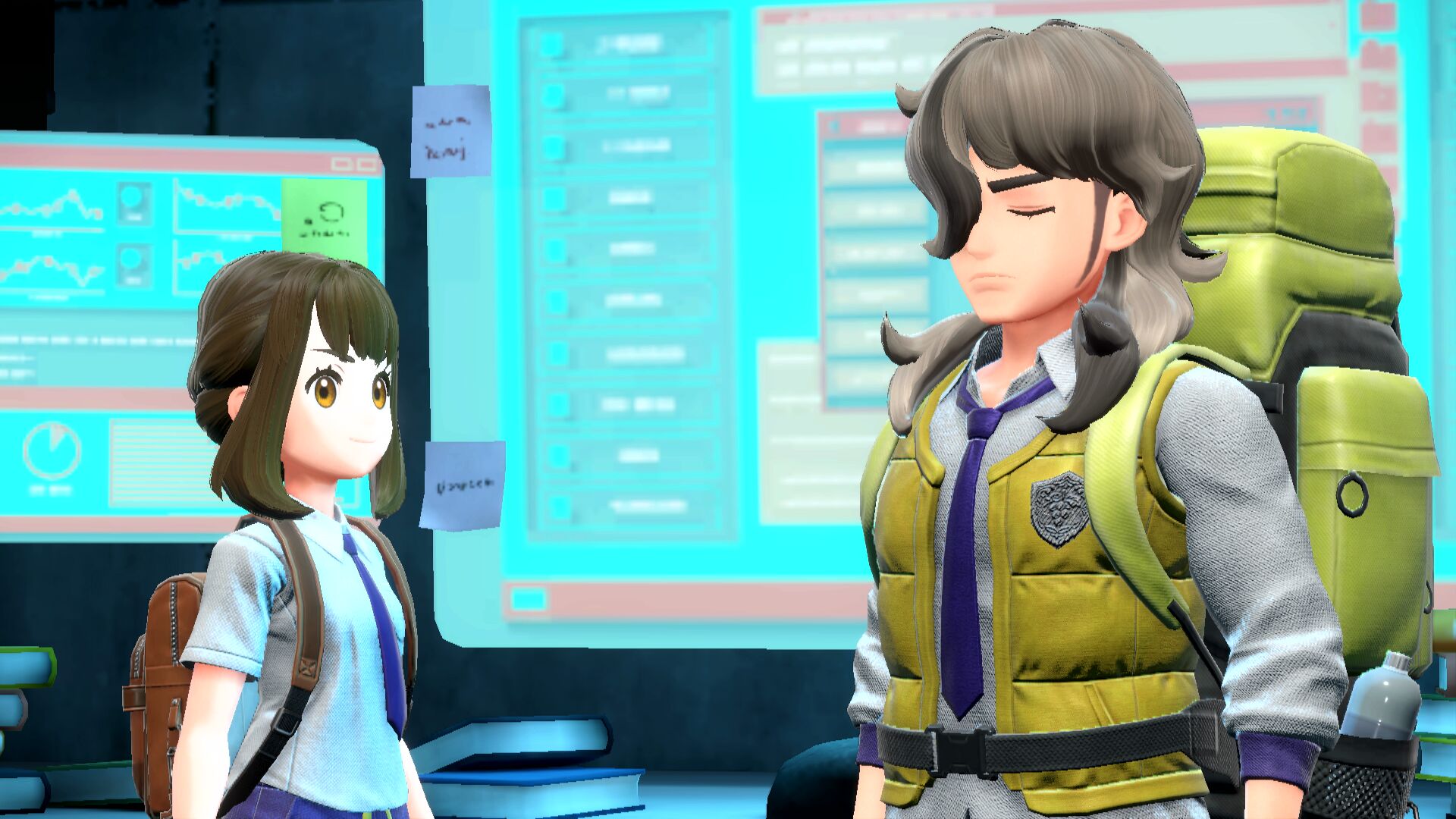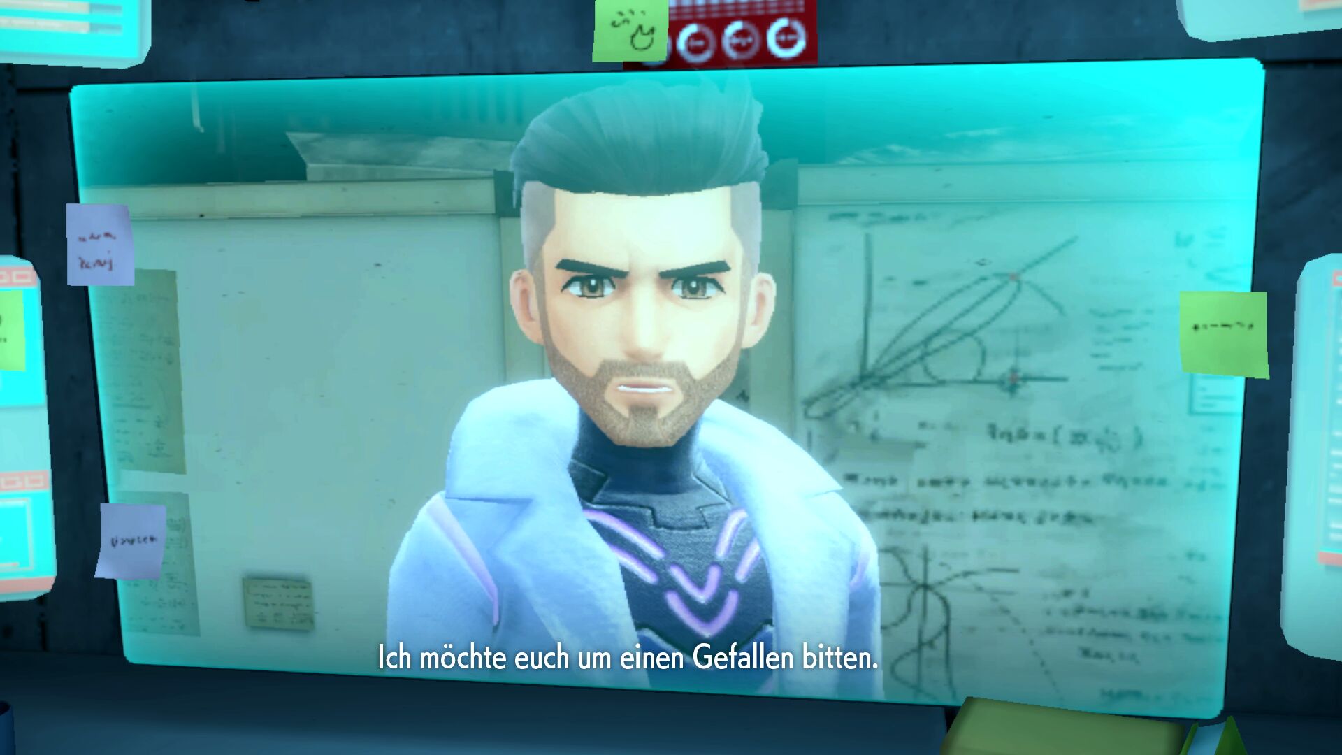 Beim Labor angekommen erhalten wir über einen Bildschirm eine weitere Videobotschaft. Wir sollen uns mit dem Karmesinbuch in Pokémon Karmesin oder dem Purpurbuch in Pokémon Purpur zur Zone Null begeben und uns dort mit dem Professor treffen. Weitere Einzelheiten werden wir vor Ort erfahren.