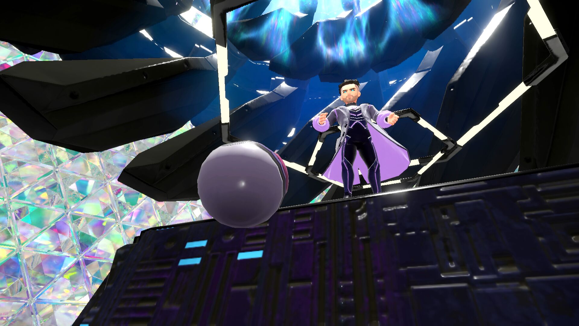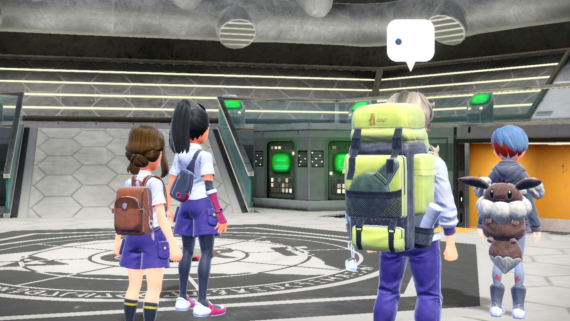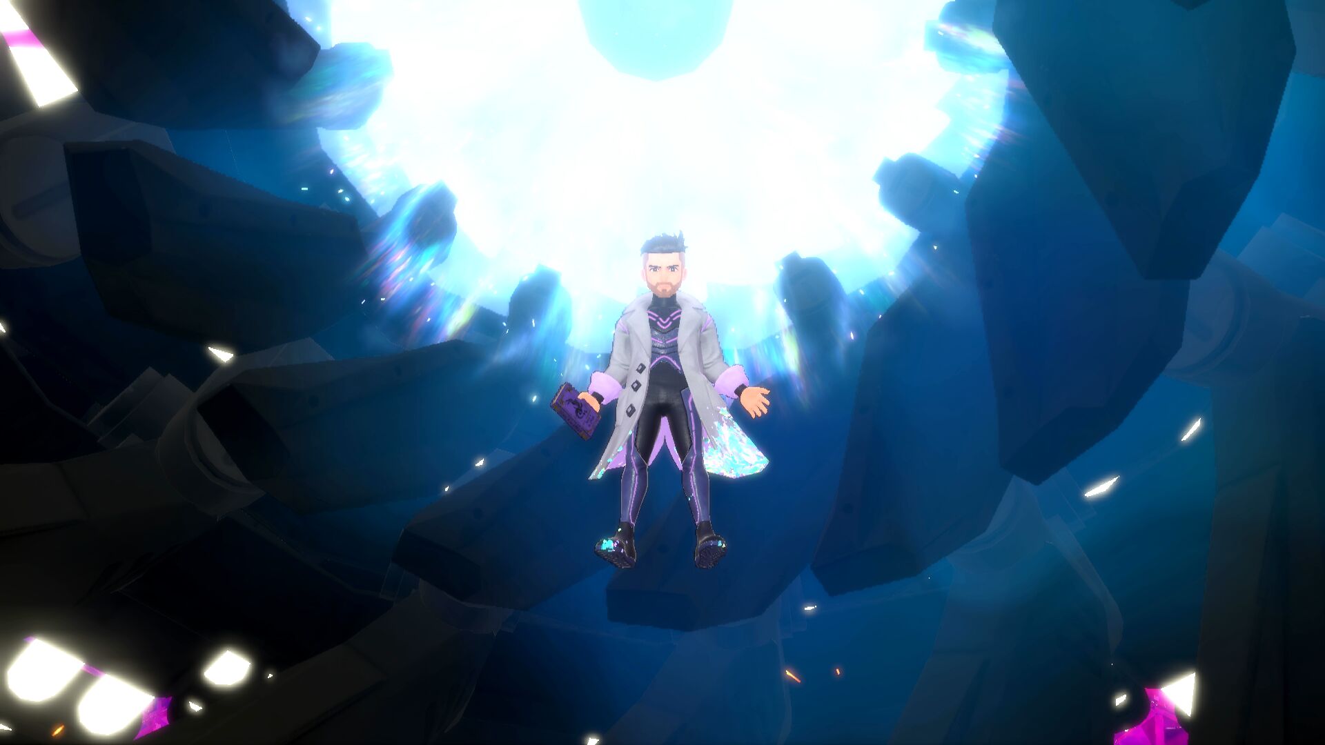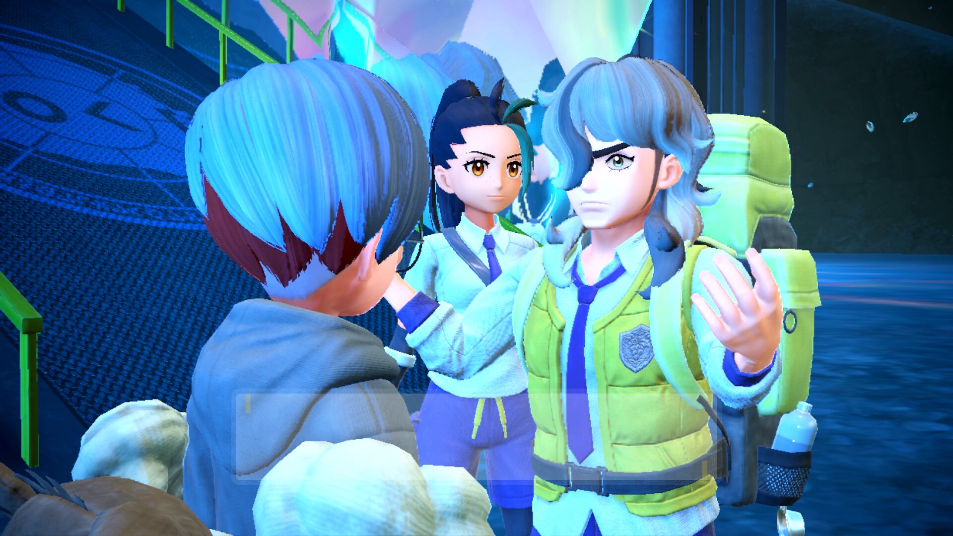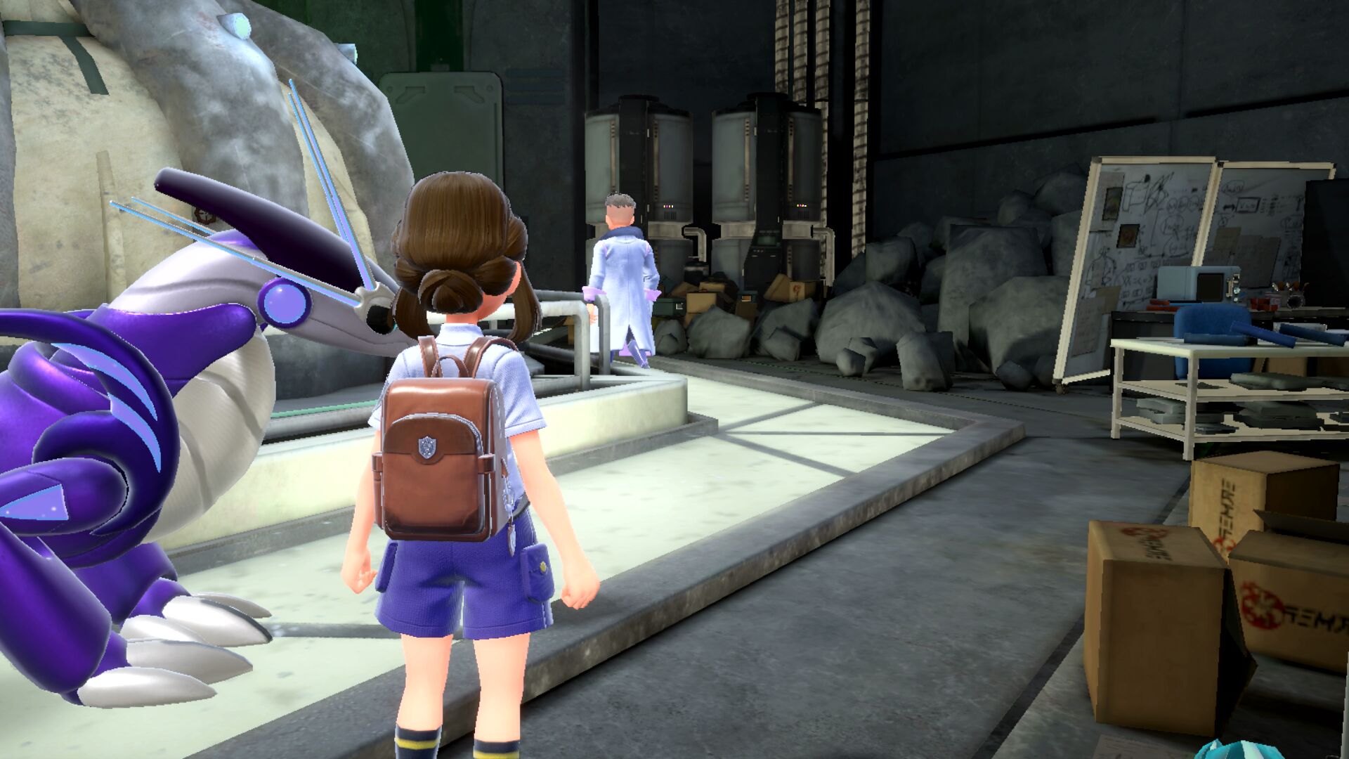 Sobald wir den Fahrstuhl betreten haben und in den nächsten Raum geleitet werden, erfahren wir die genauen Hintergründe, warum wir uns hierher begeben sollten. Bei dem Professor, der uns gegenübersteht, handelt es sich tatsächlich um eine KI, die in ihrer Denkweise ähnlich zum Original ist. Der echte Professor ist bei einem Zusammentreffen mit dem zweiten Legendären Pokémon tödlich verunglückt und die KI möchte nun, dass wir die große Forschungsarbeit des Originals, eine Zeitmaschine, ausschalten. Mit dieser konnten, gestärkt durch die Terakristallenergie im Schlund von Paldea, Pokémon aus der Vergangenheit oder der Zukunft in diese Zeit gebracht werden. Der echte Professor wollte so die Artenvielfalt erweitern, während die KI befürchtet, dass durch die immer weiter nachkommenden Pokémon das Ökosystem der Paldea-Region zusammenbrechen könnte.