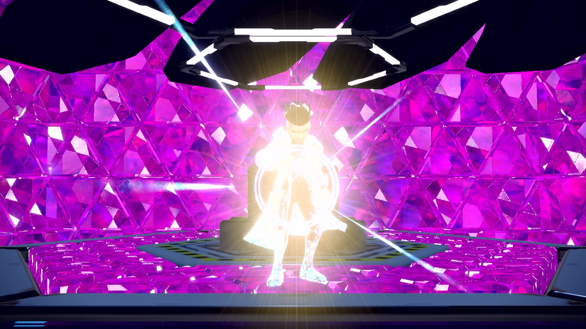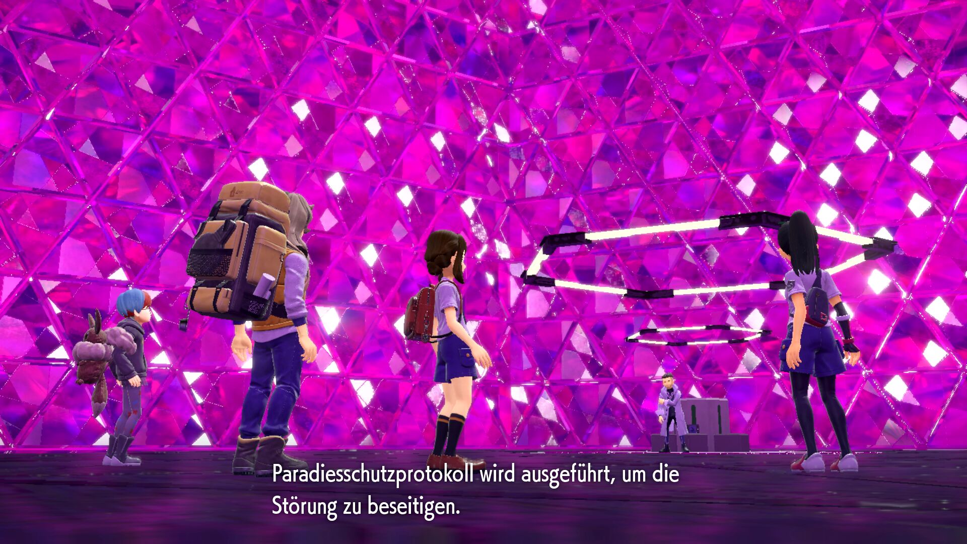 Ist der Kampf beendet, treffen auch unsere drei Partner Nemila, Cosima und Pepper ein. Obwohl die KI der Meinung war, dass nur das Offensivprogramm aktiviert werden würde, wird tatsächlich noch ein weiteres Programm geladen: Das Paradiesschutzprotokoll. Zu diesem Zweck wird nun das zweite Legendäre Pokémon in den Kampf gerufen und sämtliche Pokébälle bis auf jene, die mit der ID des Professors ausgestattet wurden, sind gesperrt. Es scheint fast so, als könnten wir diesen Kampf nicht gewinnen. Allerdings haben wir tatsächlich einen Pokéball in unserem Besitz, der die ID des Professors besitzt. Dazu wählen wir das Legendäre Pokémon aus dem Team-Menü aus und rufen es so in den Kampf. Obwohl es zuerst wieder eingeschüchtert wirkt, erhält es durch unsere Zurufe mehr Zuversicht und nimmt schließlich seine wahre Form an. In Koraidons Fall ist das die Vollkommene Gestalt, in Miraidons der Komplette Modus.
