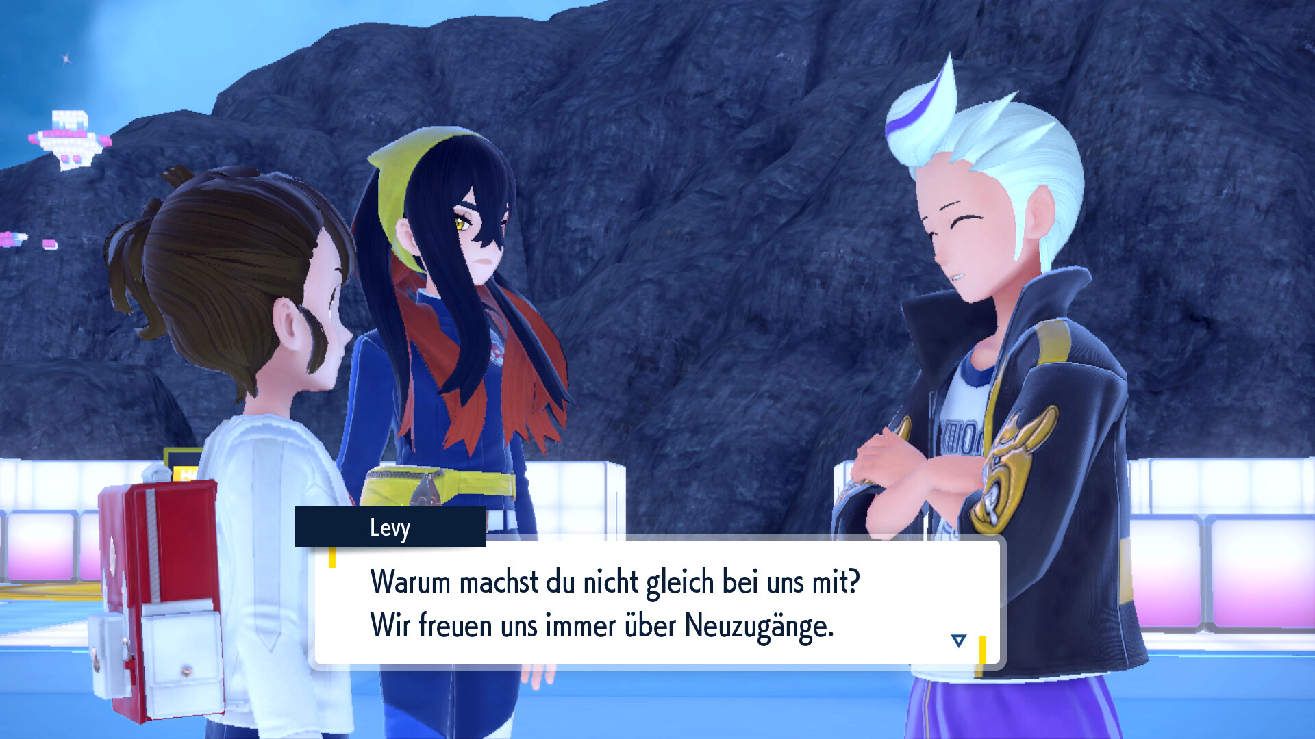 Dafür müssen wir allerdings auch etwas mehr tun. Bei Levys Herausforderung müssen drei Kämpfe mit Pokémon bestritten werden, die in der Tera-Kuppel gefangen wurden. Er erklärt das damit, dass es doch langweilig wäre, mit überlevelten Pokémon hier durchzulaufen. Wo er recht hat.