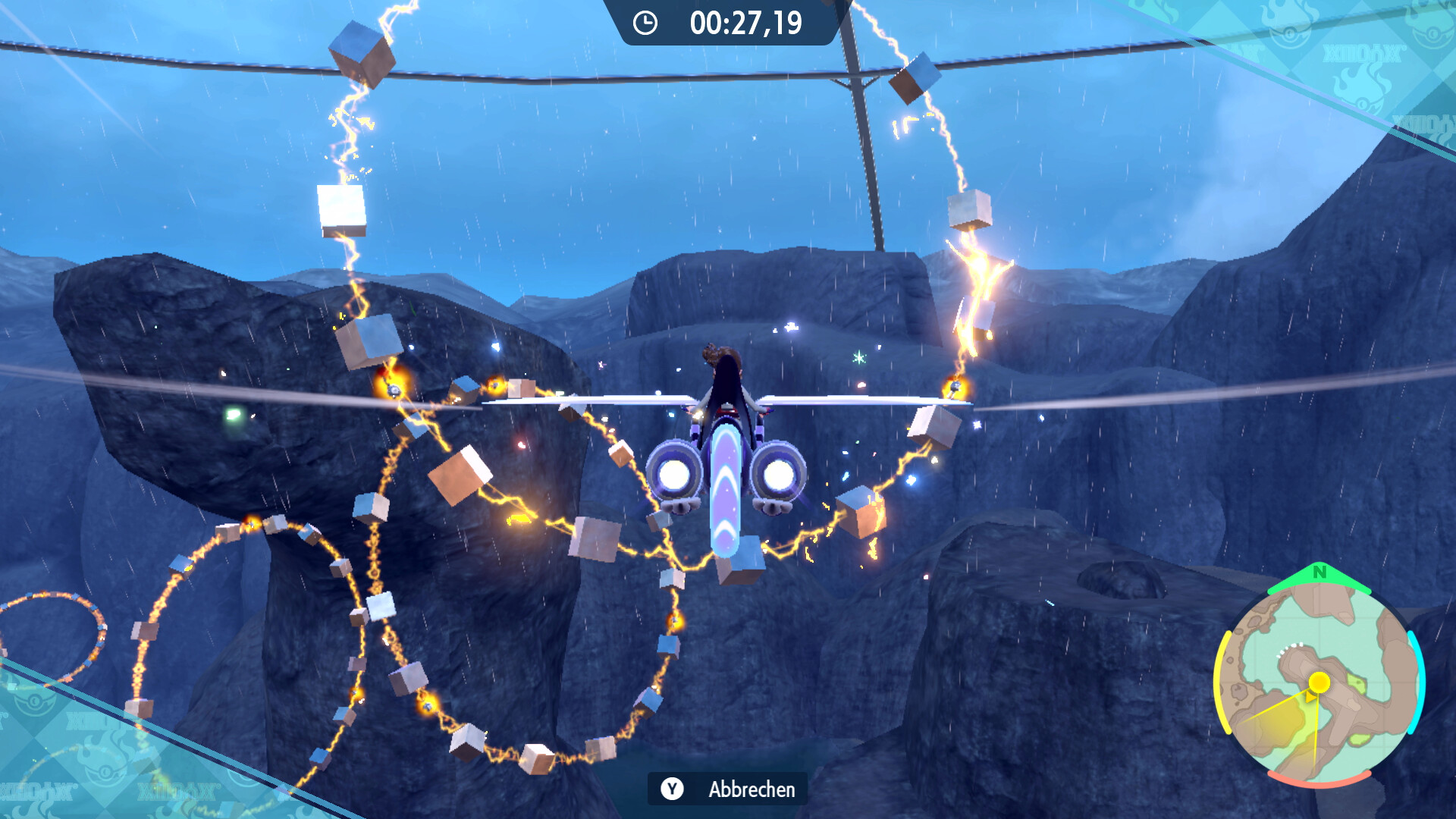 Die Aufgabe besteht nun darin, durch Neigen des linken Sticks durch die auftauchenden Ringe zu fliegen. Die Standardsteuerung fürs Fliegen ist nicht invertiert. Das bedeutet, sollte nach oben gedrückt werden, dass das Pokémon auch nach oben fliegt. In den Optionen kann die Steuerung umgestellt werden.
