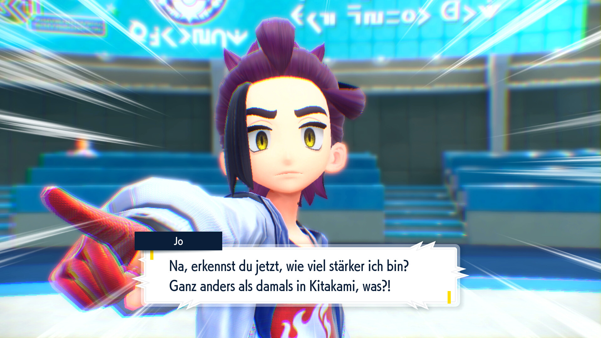 Sobald die Top Vier besiegt sind, können wir uns dem Champ der Blaubeer-Akademie stellen. Wie bereits in einigen Cutscenes gezeigt, handelt es sich dabei um Jo, den wir zuerst in Kitakami getroffen haben. Beim Eingang der Akademie sprechen wir mit der Frau am Empfang und werden daraufhin von Levy und Jo angesprochen. Letzterer brennt darauf, dass wir uns endlich im Kampf messen können. Geben wir unsere Zusage bekannt, treten wir beim Kampffeld am Haupteingang auch direkt gegen ihn an.