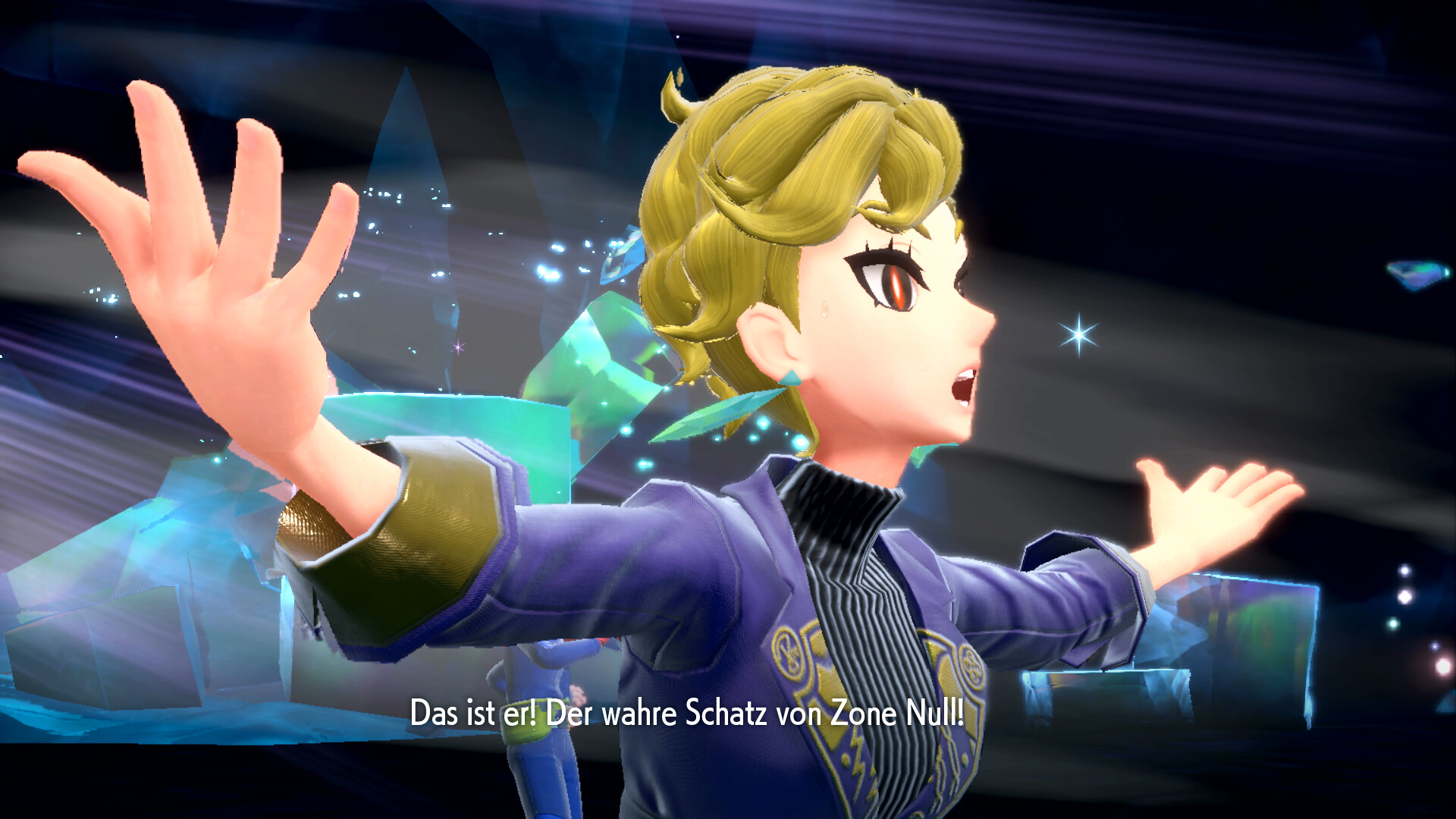Wir befinden uns im obersten Gebiet des Schlunds und bewundern zuerst die Szenerie. Dabei erfahren wir auch, dass Alondo einst wohl noch tiefer als Labor Null kam. Das sollen wir uns nun genauer ansehen. Anschließend dürfen wir uns zum tiefsten Punkt begeben, wo wir im Labor das Finale erlebt haben. Vor dem Eingang können wir beim Display die Indigoblaue Scheibe nutzen, um wieder eintreten zu können und das Höhlensystem Null anzusteuern. Brianna sieht noch einige der Dokumente durch, bevor wir schließlich mit dem Aufzug hinunterfahren. Sobald wir austreten, finden wir ein stärker kristallisiertes Gebiet und einige Aufzeichnungen vor, die vor langer Zeit angefertigt wurden. Dort wird Terapagos als der Schatz von Zone Null sowie eine Terakristallisierung, die alle Tera-Typen in sich vereint, angesprochen. Bei letzterer handelt es sich um den Tery-Typ Stellar, der uns direkt bei einem wilden Lumiflora vorgeführt wird. Zuerst müssen wir es besiegen, um den Weg in tiefere Gebiete freizumachen.