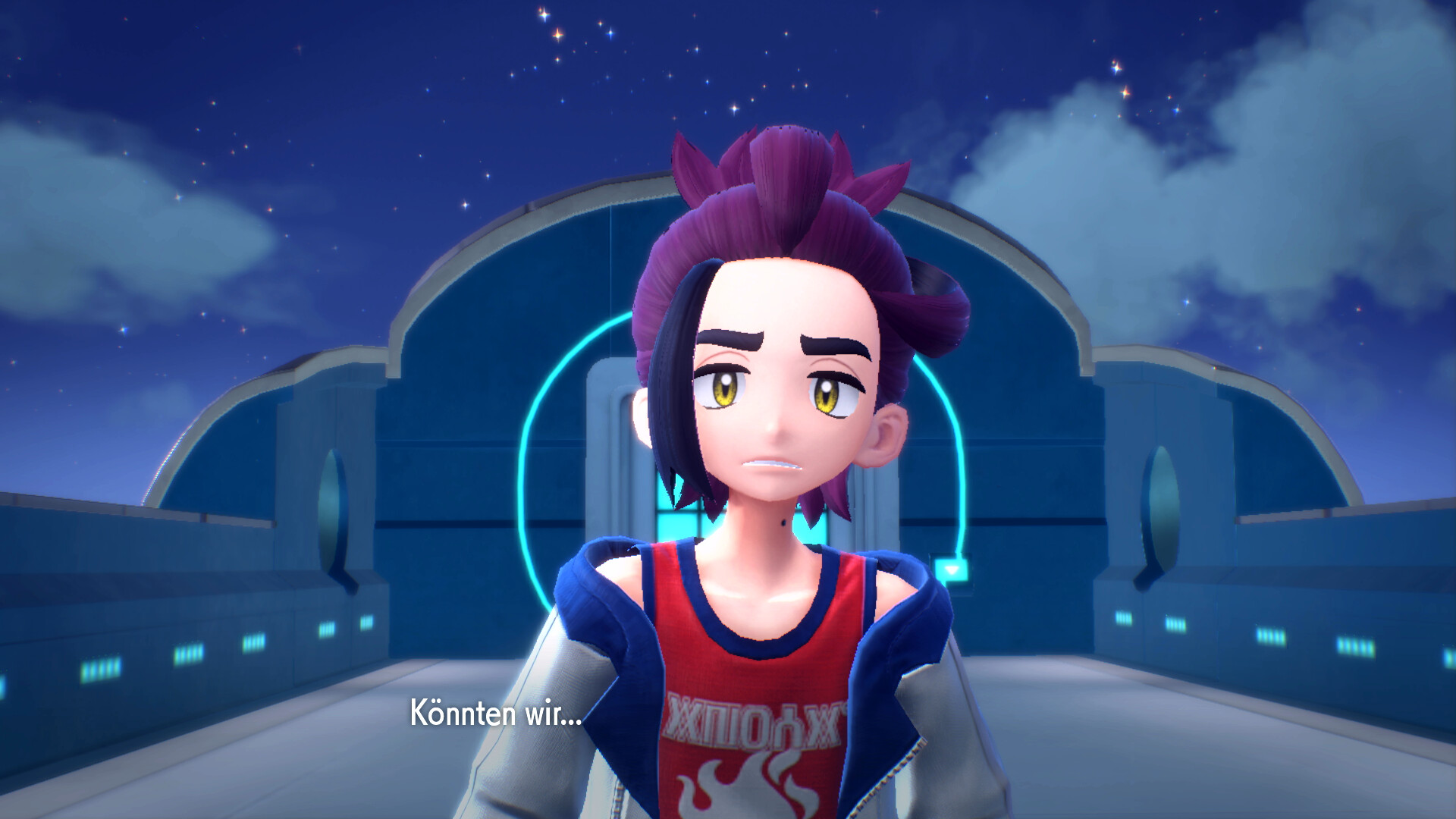 - Beim Eingang der Tera-Kuppel befindet sich Gemma mit ihrem Fukano. Sie gibt uns nicht nur eine neue Pose, sondern bei 200 registrierten Pokémon im Blaubeer-Dex zeigt sie uns Fotos von zwei Paradox-Pokémon. In Karmesin sind das Furienblitz und Keilflamme, in Purpur hingegen Eisenhaupt und Eisenfels.