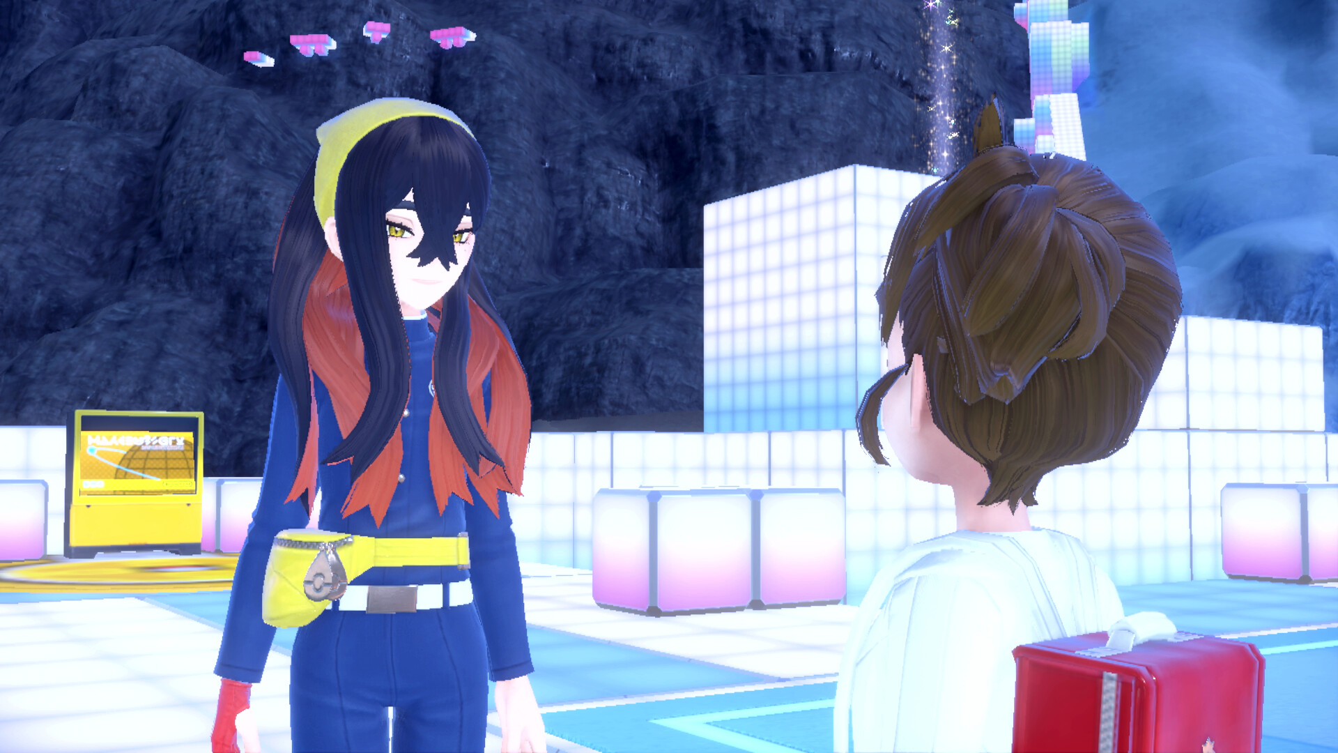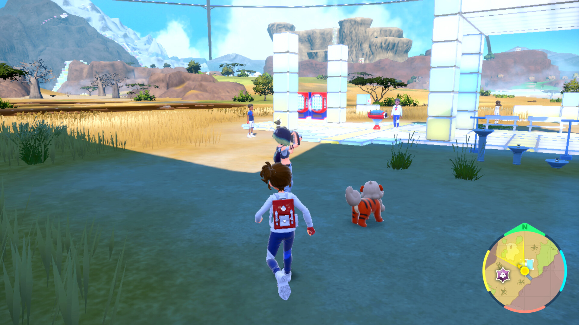 - Auf dem Zentralplatz in der Tera-Kuppel befindet sich Synchrona nahe des Heilungsautomaten. Sie verteilt die Synchromaschine, wodurch das erste Team-Pokémon auf der Overworld kontrolliert werden kann.