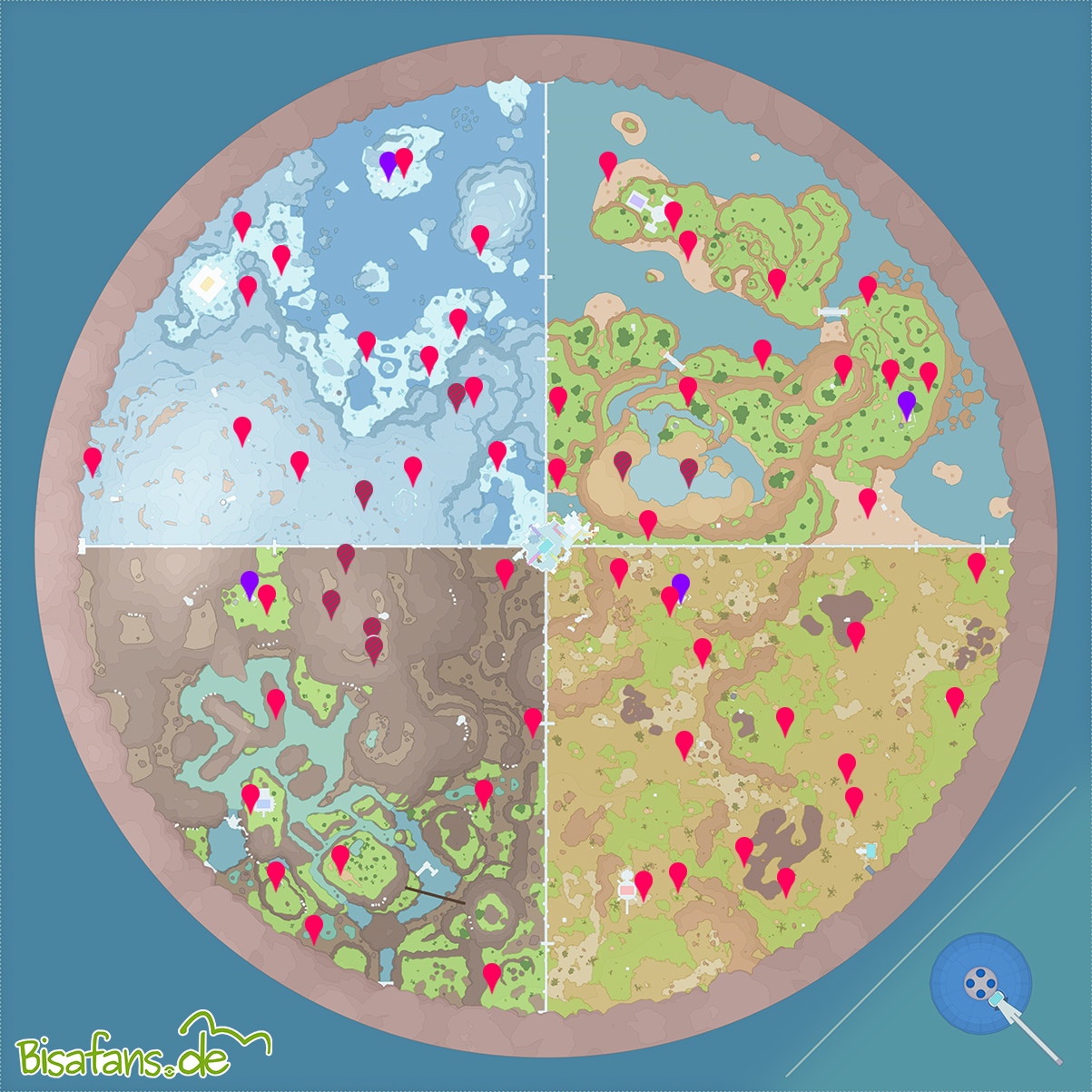 Auf der folgenden Karte findet ihr die Fundorte aller Trainer in der Tera-Kuppel. Rote Marker markieren die Standorte, rote Marker mit grauen Streifen bedeuten, dass die Trainer unterirdisch zu finden sind und lilafarbene Marker zeigen den Standort der Personen an, bei denen ihr die Belohnungen für Trainerkämpfe abholen könnt.