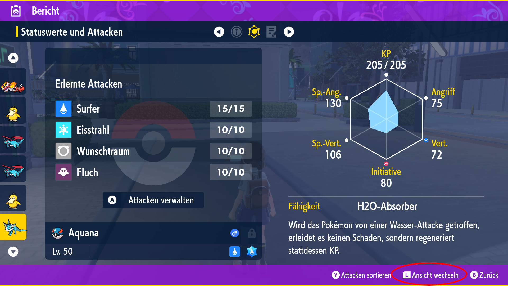 Zudem kann auch im Bericht eine ungefähre Information über die EVs eines Pokémon eingesehen werden. Geht hierfür in den Bericht eines Pokémon und schaltet diesen auf die zweite Seite um. Dort angekommen, könnt ihr die Ansicht durch die L-Taste verändern und seht nun ein Diagramm der verteilten EV-Punkte eines Pokémon. Hier können keine genauen Zahlen pro Wert eingesehen werden, jedoch wird euch durch ein Glitzern angezeigt, wenn ein Pokémon auf einem Wert die maximalen 252 EVs besitzt.