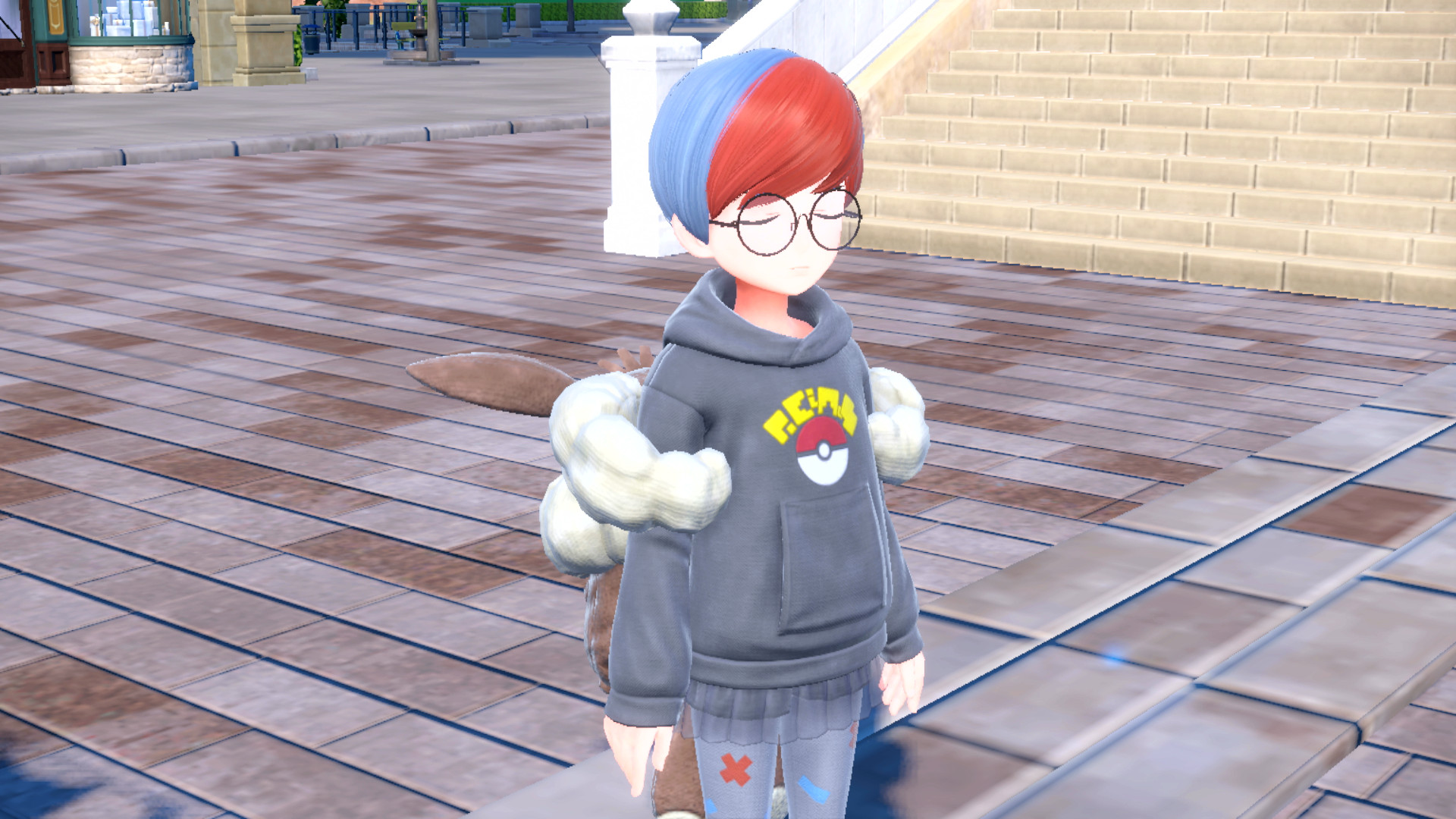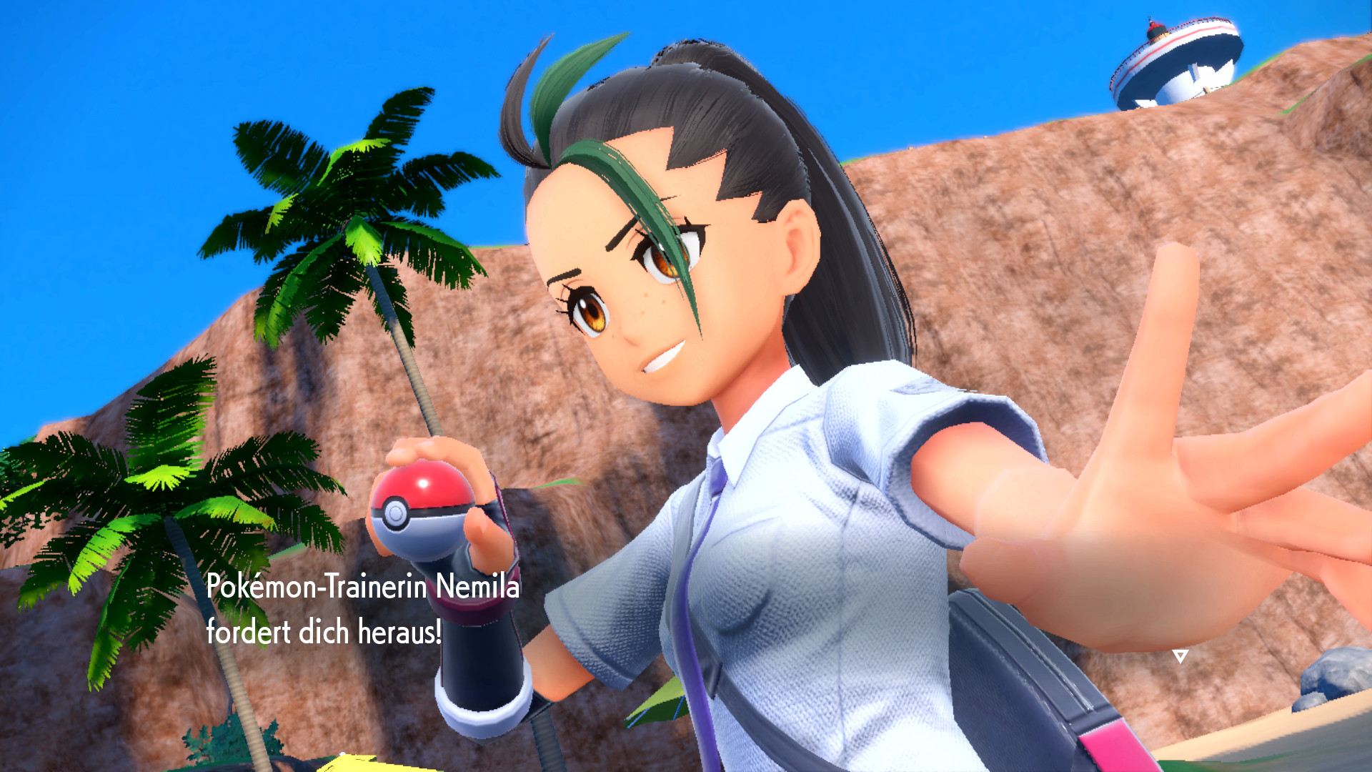 Sobald wir am Ende der Straße die Treppen hochsteigen, lernen wir Nemila kennen, die sich gern mit uns anfreunden möchte. Wir erfahren außerdem, dass sie bereits einer der Champs der Region ist, gerne aber das Abenteuer mit uns gemeinsam erleben möchte. Dazu wählen wir nun eines der drei Pokémon aus, die uns bisher begleitet haben.