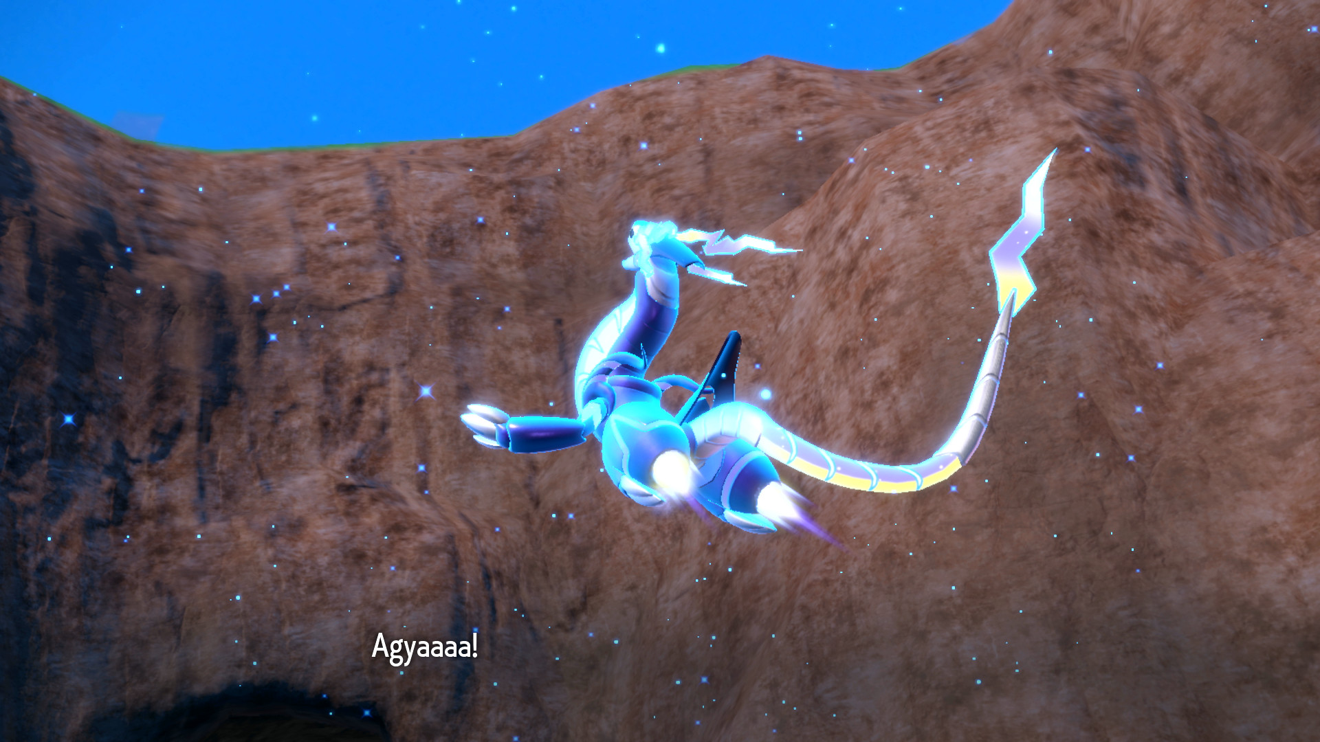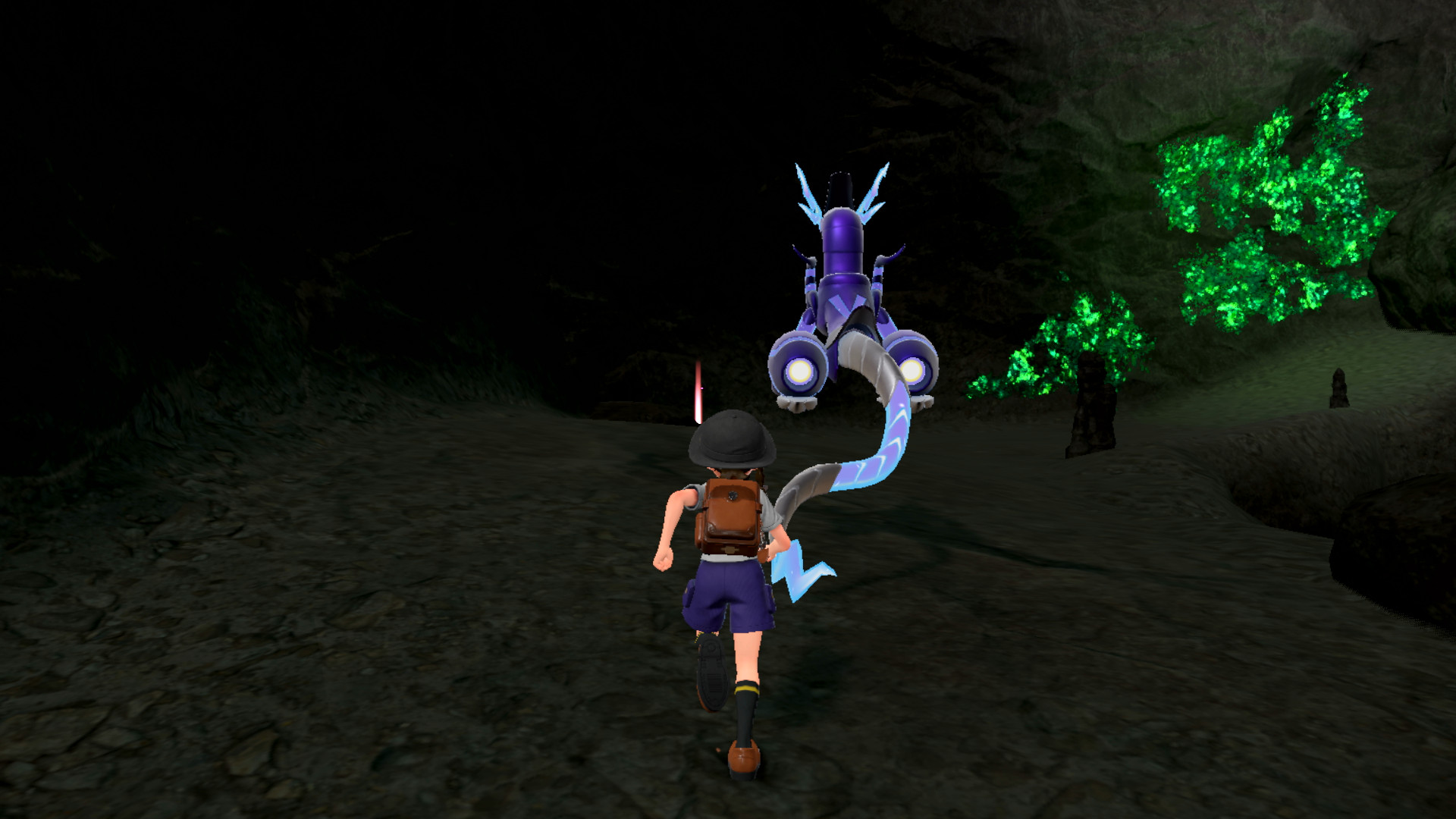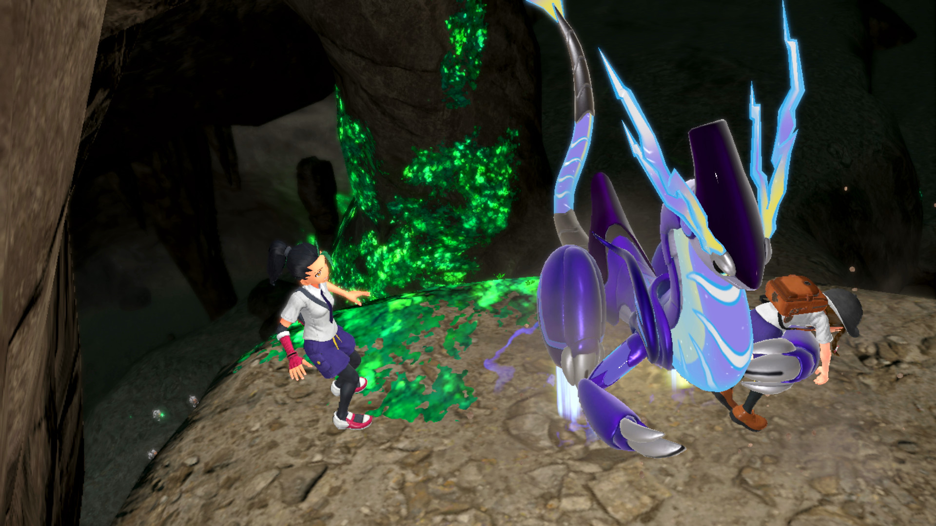 In der Höhle befinden sich wilde Pokémon, die bekämpft und gefangen werden können. Beim Aufstieg ruft uns Nemila von ganz oben und fragt nach unserem Wohlbefinden. All zu weit kommen wir jedoch nicht, da wir schließlich von mehreren Hunduster eingeengt werden. Zu allem Überfluss taucht auch noch ein Hundemon auf, das uns levelmäßig weit überlegen ist. Der Einsatz unseres Partners zu einem Kampf wird durch einen Brüller seitens Hundemons zunichte gemacht und es scheint fast so, als würden wir Futter für die Pokémon werden. Miraidon, eigentlich gewillt, es mit den wilden Pokémon aufzunehmen, scheint um uns besorgt zu sein. Daraufhin schnappt es uns und trägt uns zum oberen Ausgang, wo wir auch Nemila wieder treffen. Aufgrund der Anstrengungen in kurzer Zeit geht unsere mysteriöse Begleitung jedoch wieder erschöpft zu Boden.