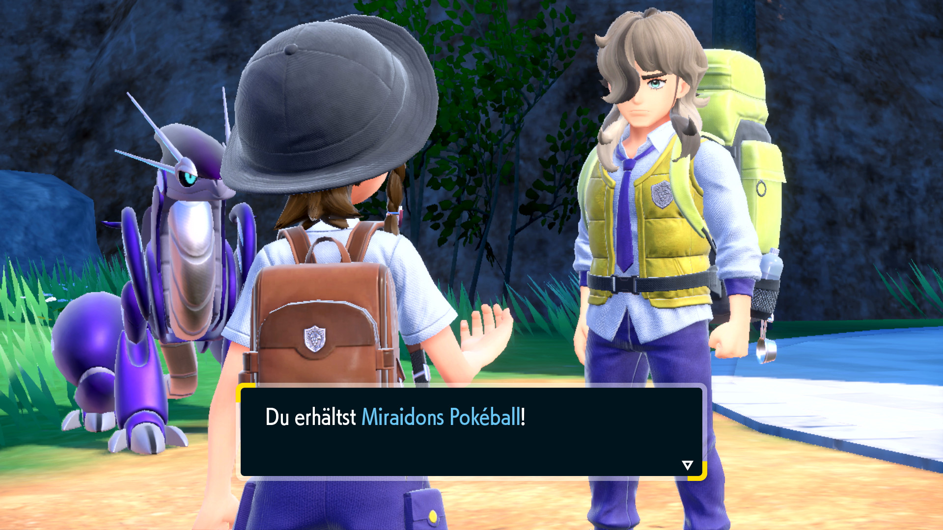 Im Anschluss erhalten wir Miraidons Pokéball. Bevor wir uns überhaupt erkundigen können, was es so speziell macht, läuft Pepper erleichtert davon. Nun gut, verschieben wir das auf später.