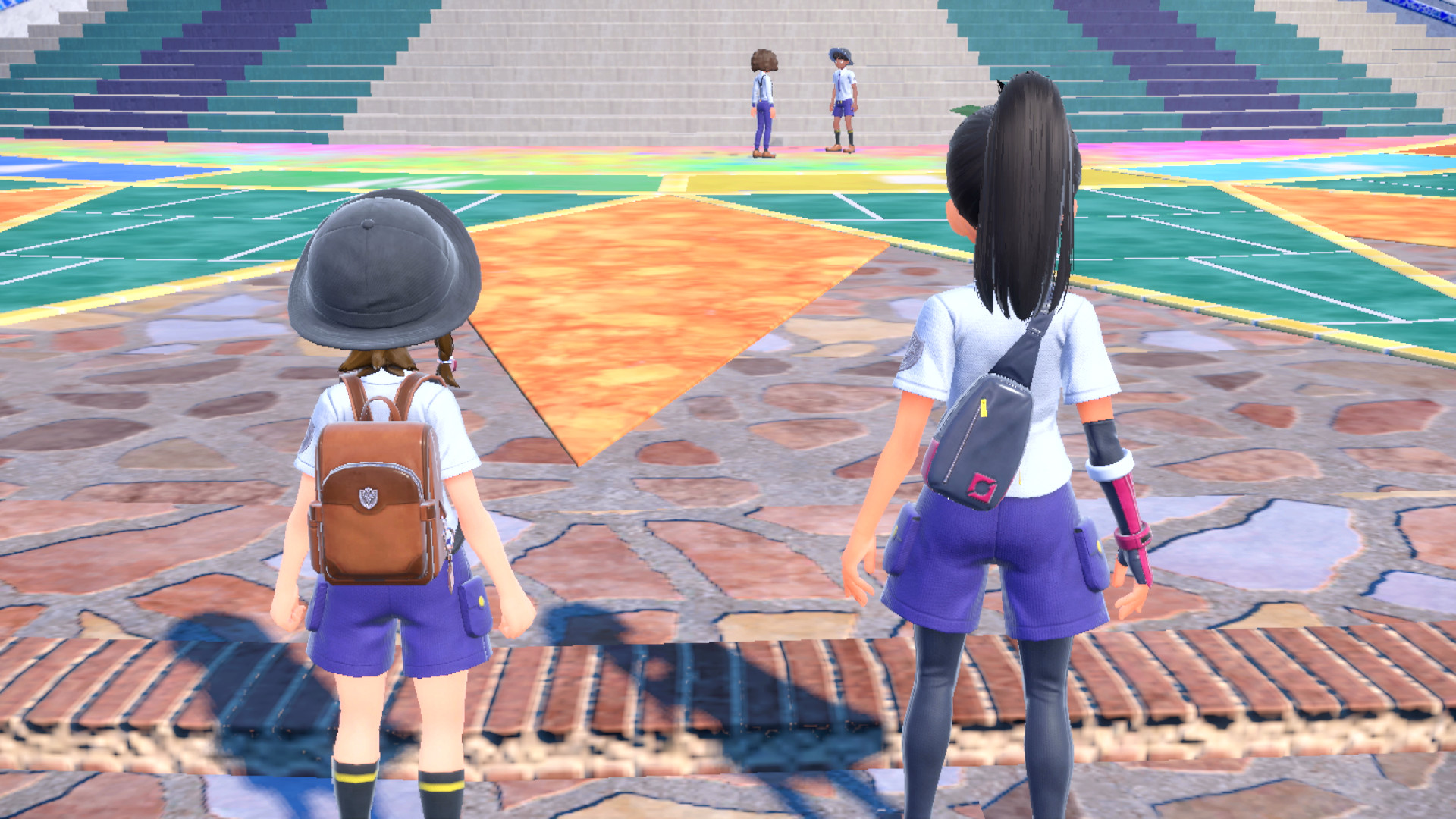 Nach der Zeremonie treffen wir außerhalb der Akademie Nemila und Pepper, die uns nach unserem nächsten Ziel fragen. Wie bereits zuvor erwähnt möchte Nemila, dass wir die Arenen herausfordern und schlägt daher vor, Mesalona City durch das Westtor nach Moldrid zu verlassen. Pepper möchte währenddessen die Geheimgewürze sammeln und meint, der schnellste Weg zum ersten Gegner wäre durch das Osttor der Stadt. Per Smart-Rotom werden wir allerdings auch von Cassiopeia kontaktiert, um die Standorte der Team-Star-Basen zu erhalten. Zum Schluss erfahren wir auch, wie es ist, auf Miraidon zu sitzen, da es uns nun beherzt auf seinen Rücken lässt.