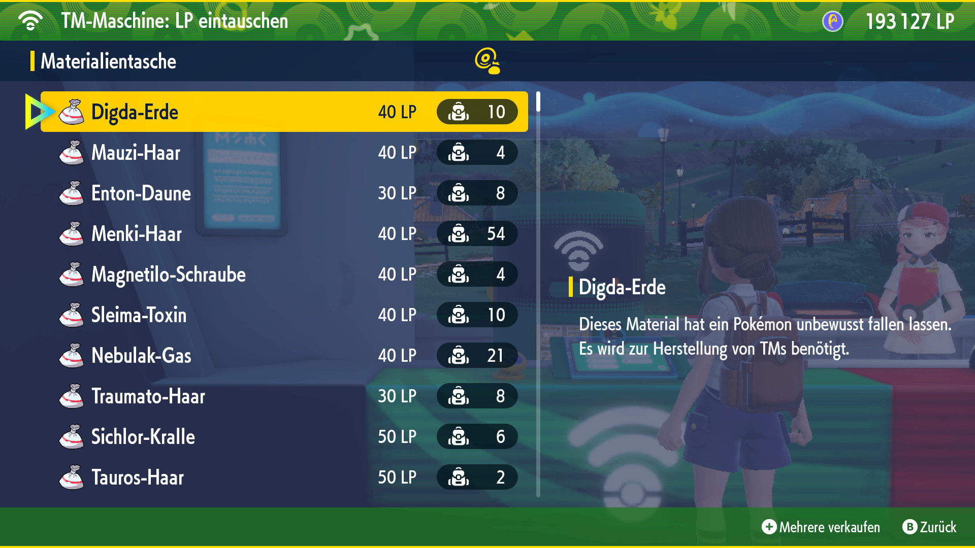 Direkt bei der TM-Maschine ist es möglich als Menüpunkt "Materialien gegen LP eintauschen" auszuwählen. Diese Funktion ermöglicht es somit gesammelte Resscourcen von Pokémon gegen LP einzutauschen. Hierbei geben die Materialien von Pokémon, die tendenziell seltener erscheinen, mehr LP als jene, die sehr häufig auf der Karte sind. Für Spieler, die viel Kämpfen oder Massive Aufläufe nutzen, kann diese Option eine Möglichkeit sein die gesammelten Materialien zu nutzen.