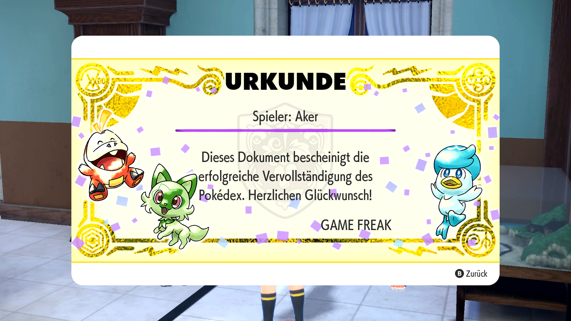 Der Schillerpin ist ein beliebtes Item in Pokémon. Er bewirkt, dass sich die Chance auf Schillernde Pokémon zu treffen von 1:4096 auf 1:1365 ändert, was eine sehr große Erhöhung der Chancen bedeutet. Der Schillerpin kann jedoch erst erhalten werden, wenn alle 400 Pokémon aus dem Paldea-Pokédex erfolgreich gefangen wurden. Ist dies geschafft, erwartet euch Señor Jim im Biologieraum der Akademie und schenkt euch dort nicht nur ein Urkunde, sondern auch einen Schillerpin.