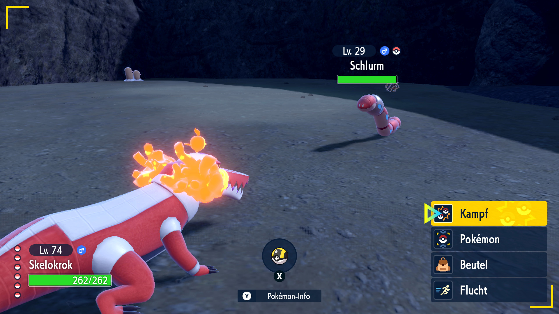 Auch, wenn ihr euch an das Pokémon heran schleicht kann kein Kampf begonnen werden, da es sehr schreckhaft ist. Um gegen ein Schlurm kämpfen zu können, muss sich daher auf Miraidon oder Koraidon verlassen werden. Durch den Abschluss von Kämpfen gegen Titanen in der Region, werden euer Miraidon und Koraidon stets aufgewertet und erhalten neue Funktionen. Eine Funktion davon ist das Sprinten, was es erlaubt besonders schnell auf dem Rücken des Pokémon zu reiten.