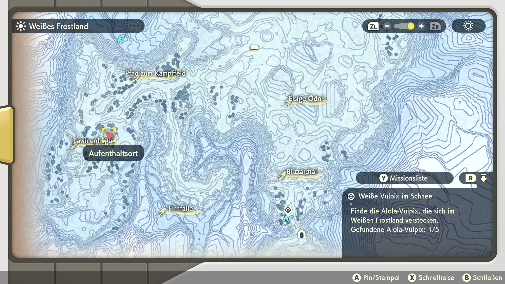 An den folgenden Stellen (markiert durch den roten Standort-Pfeil) können die fünf Alola-Vulpix für diese Mission gefunden werden.
