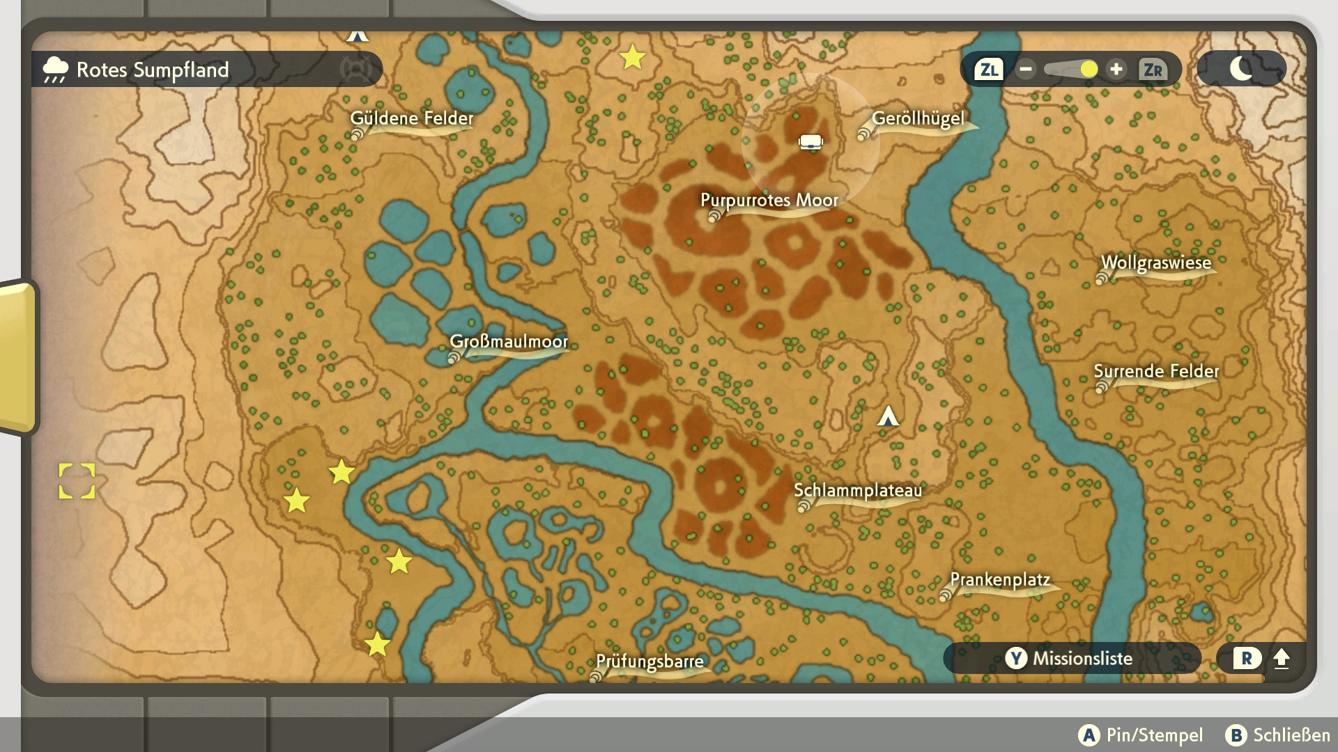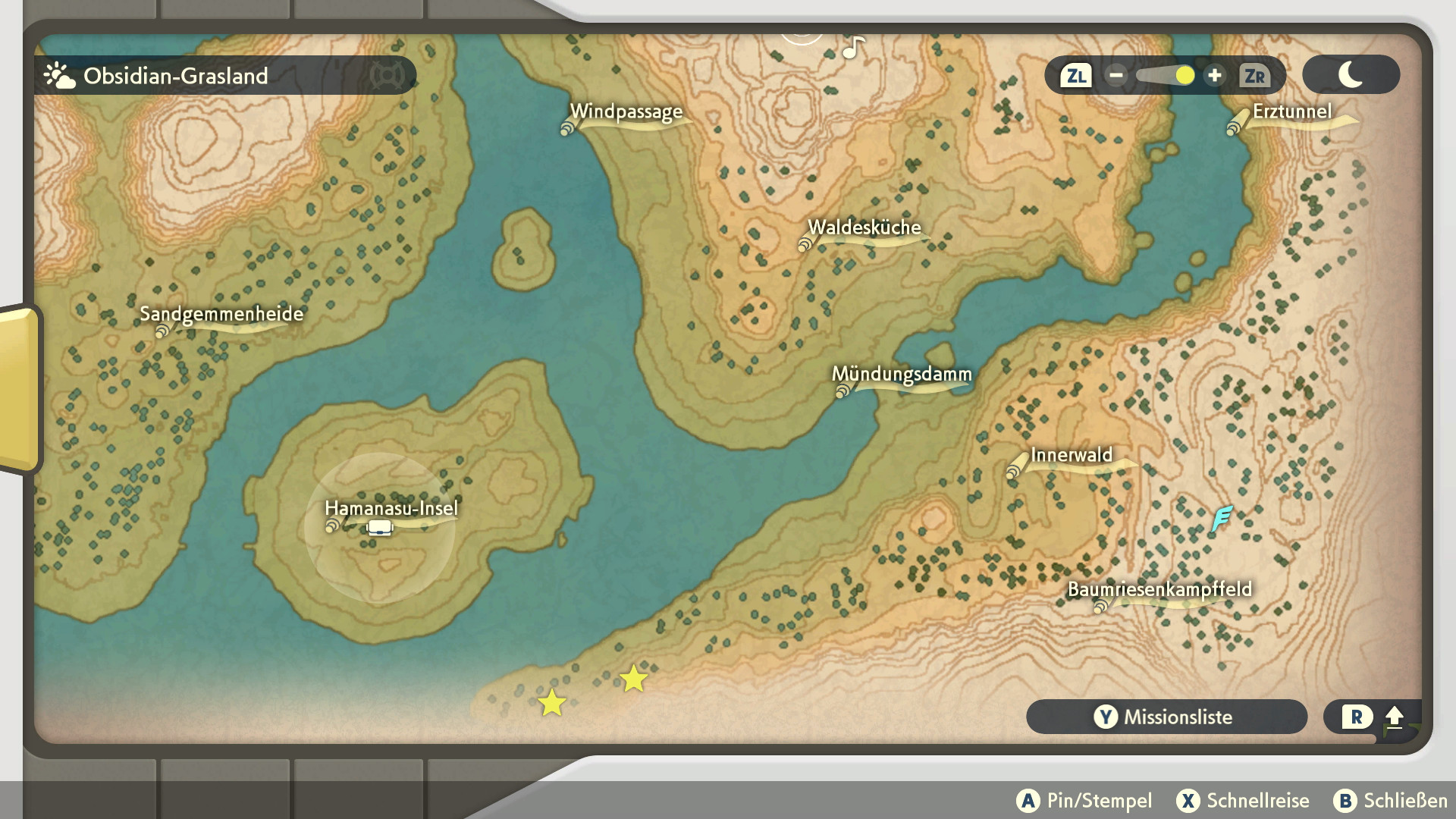 Da es im Obsidian-Grasland nur zwei Bäume gibt an denen die beiden Pokémon erscheinen können und der Weg zu ihnen sehr lange dauert, da kein Flugpukt in unmittelbarer Nähe ist, kann es etwas dauern, bis ihr dort die beiden Pokémon finden könnt.