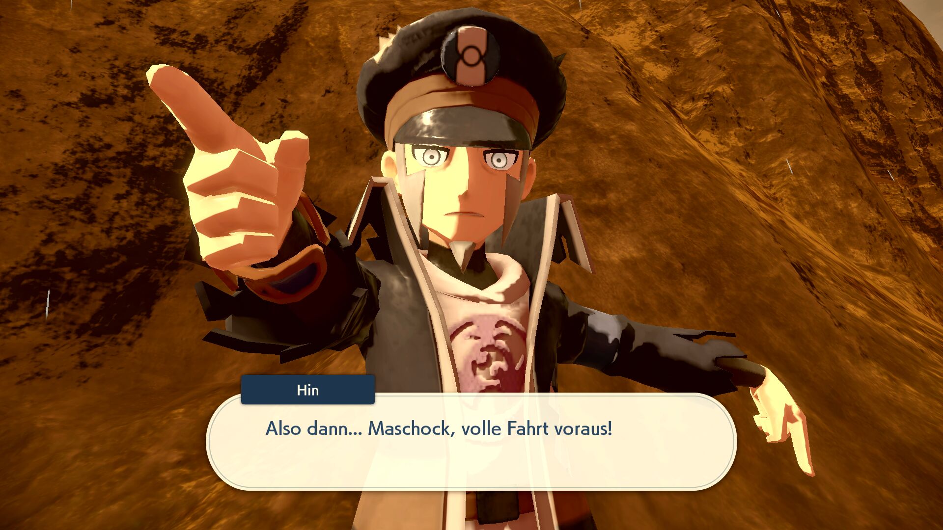 Hin begleitet uns zum Kraterberg-Hochland, wo wir mit ihm gemeinsam den Berg besteigen sollen. Er führt uns dabei zu Snieboss, dem Pokémon, mit dem er als Wächter des Perl-Clans verbunden ist.