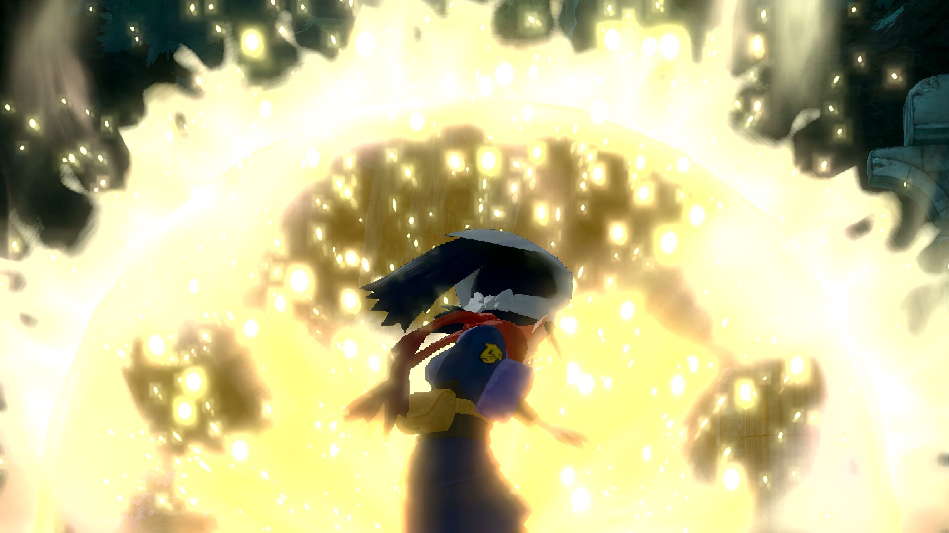 In der Höhle folgen wir Hin aufgrund des fehlenden Lichtes. Nicht dass wir nicht genug sehen würden, aber er erzählt uns ein bisschen aus seiner Vergangenheit und seinem Partner, mit dem er immer gekämpft hat. Am Ende des Weges finden wir an die Höhlenwand gelehnt einige Fackeln, die wohl ursprünglich einen Pfad markierten. Wir stellen sie wieder auf und folgen Hin bis zum Uralten Steinbruch. Dort treffen wir erneut auf Tsubaki, der sich als Übeltäter für das fehlende Licht herausstellt. Er möchte uns nun gerne aufhalten, indem er gegen uns kämpft. Siegessicher scheint er jedenfalls zu sein.