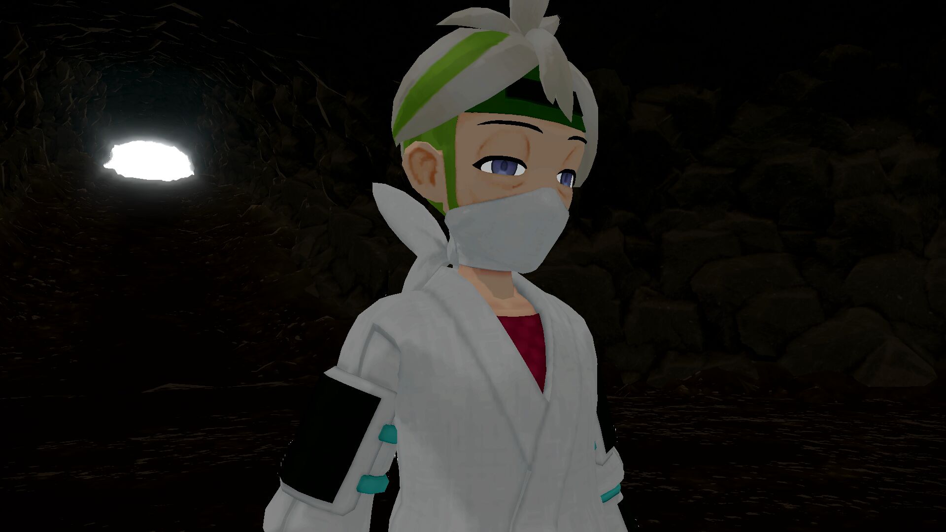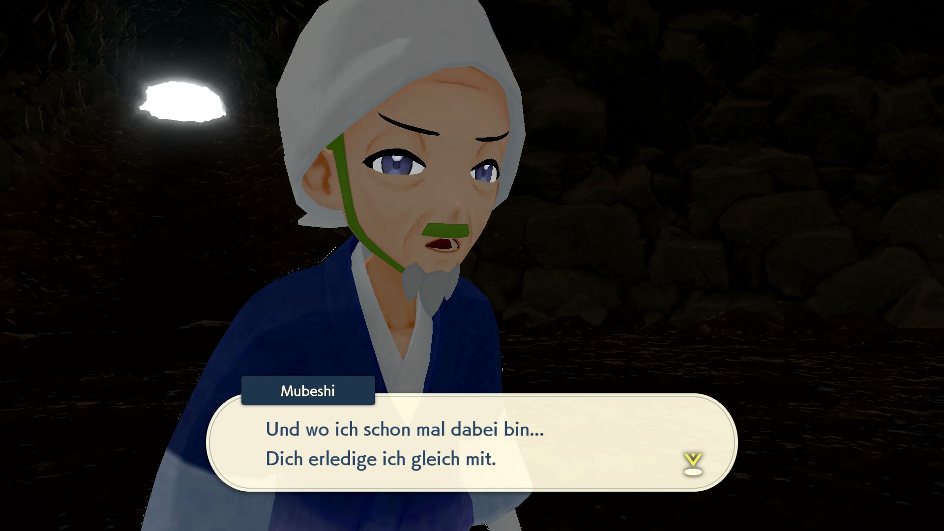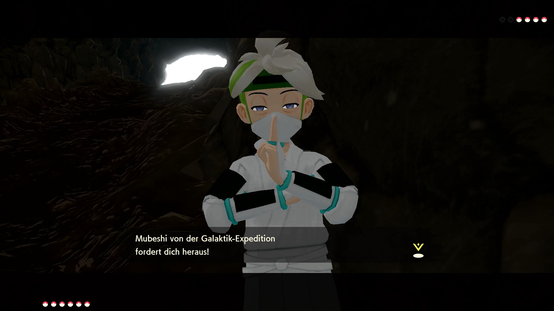 Im Inneren der Höhle treffen wir auf Mubeshi, der sich uns in den Weg stellt. Er gibt sich als Denbokus Problemlöser zu erkennen und möchte uns unter allem Umständen aufhalten, damit die Galaktik-Expedition von Erfolg gekrönt ist. Um weiter zu gelangen, müssen wir also erst diesen Kampf gewinnen.